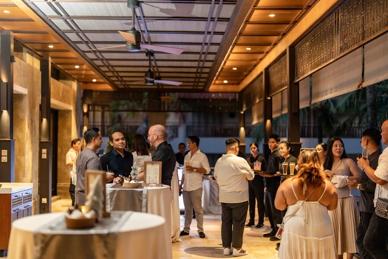 The evening began as invited local media gathered at Spice Terrace for a welcome cocktail session. Against a backdrop of white and silvery décor inspired by the Tropical Winter Wonderland theme, we mingled under soft festive lighting while Christmas melodies played in the background. The setting immediately set a celebratory yet elegant tone, blending the warmth of the holiday season with Conrad Bali’s refined tropical identity.