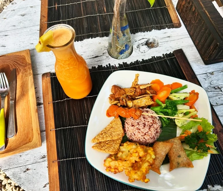 Tucked away in Seminyak, Tasty Vegan offers a peaceful escape from the area’s lively streets. Surrounded by lush greenery and calming water features, the restaurant serves all vegan dishes with generous portions and comforting flavours. Local favourites like nasi campur and vegan fried rice consistently win praise, while small touches such as complimentary soup add to the welcoming atmosphere. It is a place designed to nourish both body and soul, perfect for relaxed lunches and unrushed dinners.