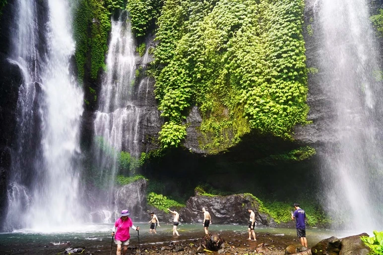 Banyumala Waterfall sits high between Munduk and Bedugul, surrounded by cool mountain air and lush greenery. Often called Banyumala Twin Waterfalls, the scene is more poetic than dramatic. Hundreds of smaller streams slide down the cliff and converge into two main flows, forming a wide and soothing cascade rather than a single drop. The pool below is inviting but shockingly cold. Facilities include a small changing room and a shaded pagoda where you can take a break. During flowering season, colorful blooms line the area and turn this already photogenic spot into an Instagram favorite.