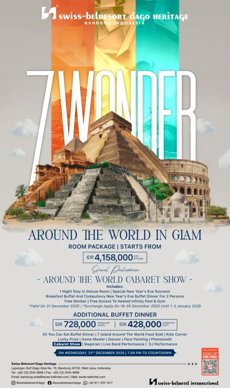 Rather than a typical dinner event, the night is crafted as an immersive, multi-genre celebration—one that encourages guests to dance, dine, and delight in the festive spirit. “With its lush surroundings, crisp air, and sweeping hillside views, Swiss-Belresort Dago Heritage Bandung has long been a favourite escape for travellers seeking tranquillity with a touch of sophistication. This year’s 7 Wonders program adds a new layer of excitement—combining the comfort of a scenic stay with the energy of themed festivities and global-inspired dining. For travellers hoping to end 2025 with meaningful moments, vibrant celebrations, and effortless holiday planning, the resort’s Christmas and New Year offerings create an all-encompassing festive experience designed to be remembered long after the season ends.” Said Mr. Gerri Primacitra, General Manager of Swiss-Belresort Dago Heritage.