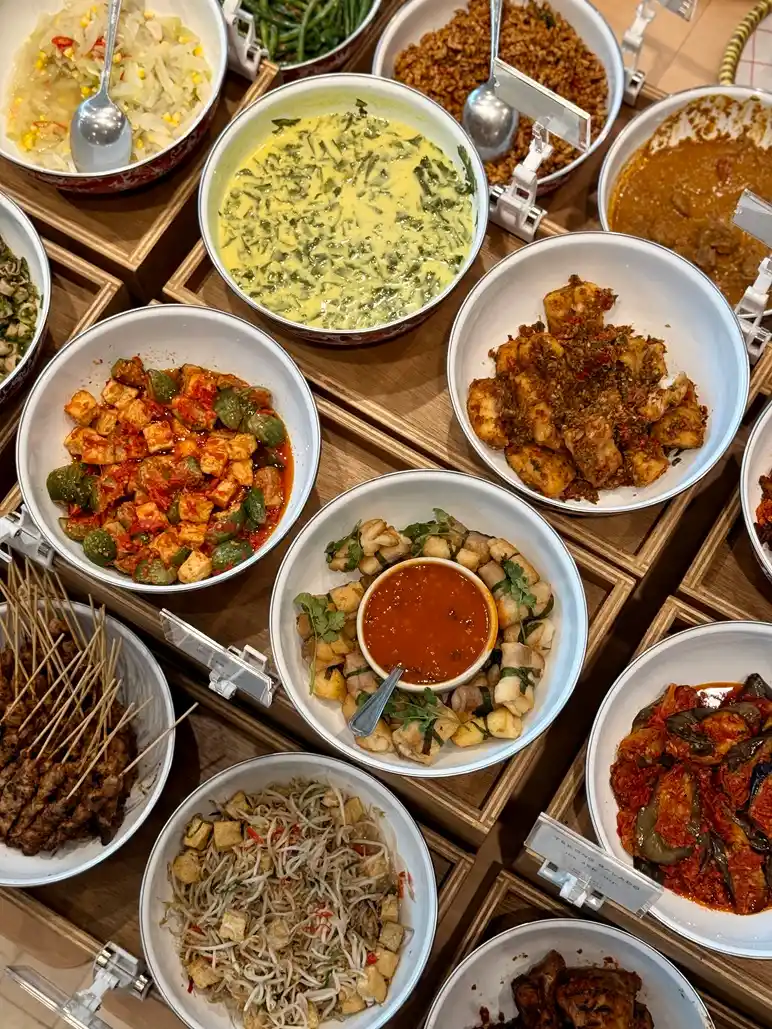 Featuring comforting dishes such as Lidah Cabe Hijau, Rendang Basah, Opor Ayam, Ayam Bakar Bumbu Rujak, Ikan Seabass Bumbu Kencur, and Cumi Balado Hijau, alongside traditional vegetables and sides like Sayur Krecek, Sambal Goreng Kentang Ati Ampela, and Kering Tempe Daun Jeruk.