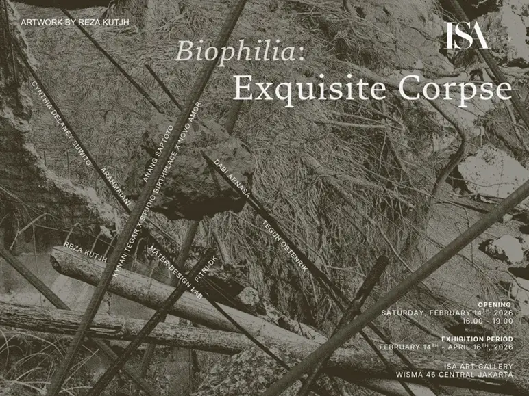 Biophilia is a biannual exhibition series by ISA Art Gallery dedicated to ecological discourse and resistance. This edition brings together nine artists including Arahmaiani, Dabi Arnasa, Anang Saptoto, Cynthia Delaney Suwito, Fitri DK, Kynan Tegar in collaboration with Studio Birthplace and Novo Amor, Mater Design Lab, Reza Kutjh, and Teguh Ostenrik. Drawing from the Surrealist method of collective image-making, Exquisite Corpse unfolds through layered and unexpected connections, forming a shared field of thought that reflects ecological interdependence. At its core, the exhibition considers how bodies and systems exist within an ecosystem shaped by ongoing violence and extraction. It asks how we continue to inhabit such a world while pointing toward the urgency of collective awareness and response.
