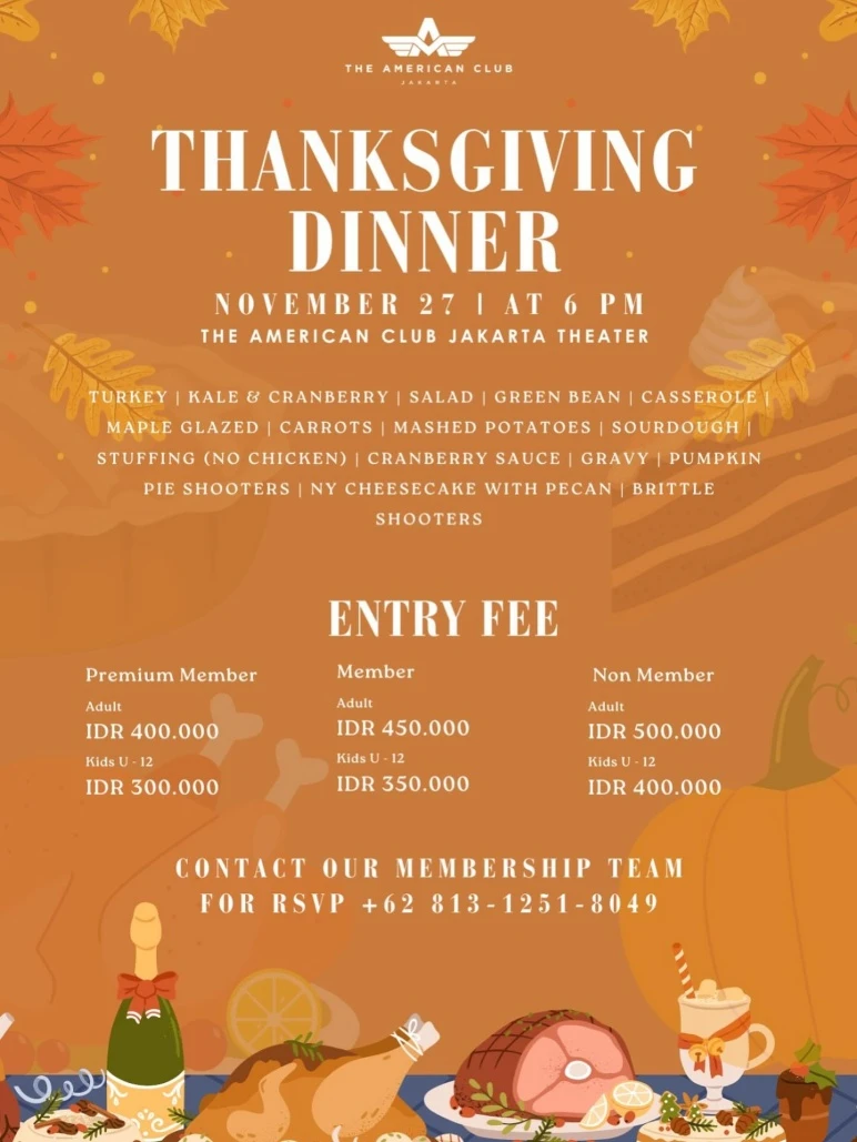 This Thanksgiving, The American Club Jakarta welcomes you to an evening of warmth, gratitude, and connection. Join us on November 27 at 6 PM for a cozy dinner featuring comforting dishes, friendly conversations, and a joyful holiday atmosphere. Created to bring people together, this special gathering is a simple and heartfelt way to celebrate the spirit of Thanksgiving in Jakarta.