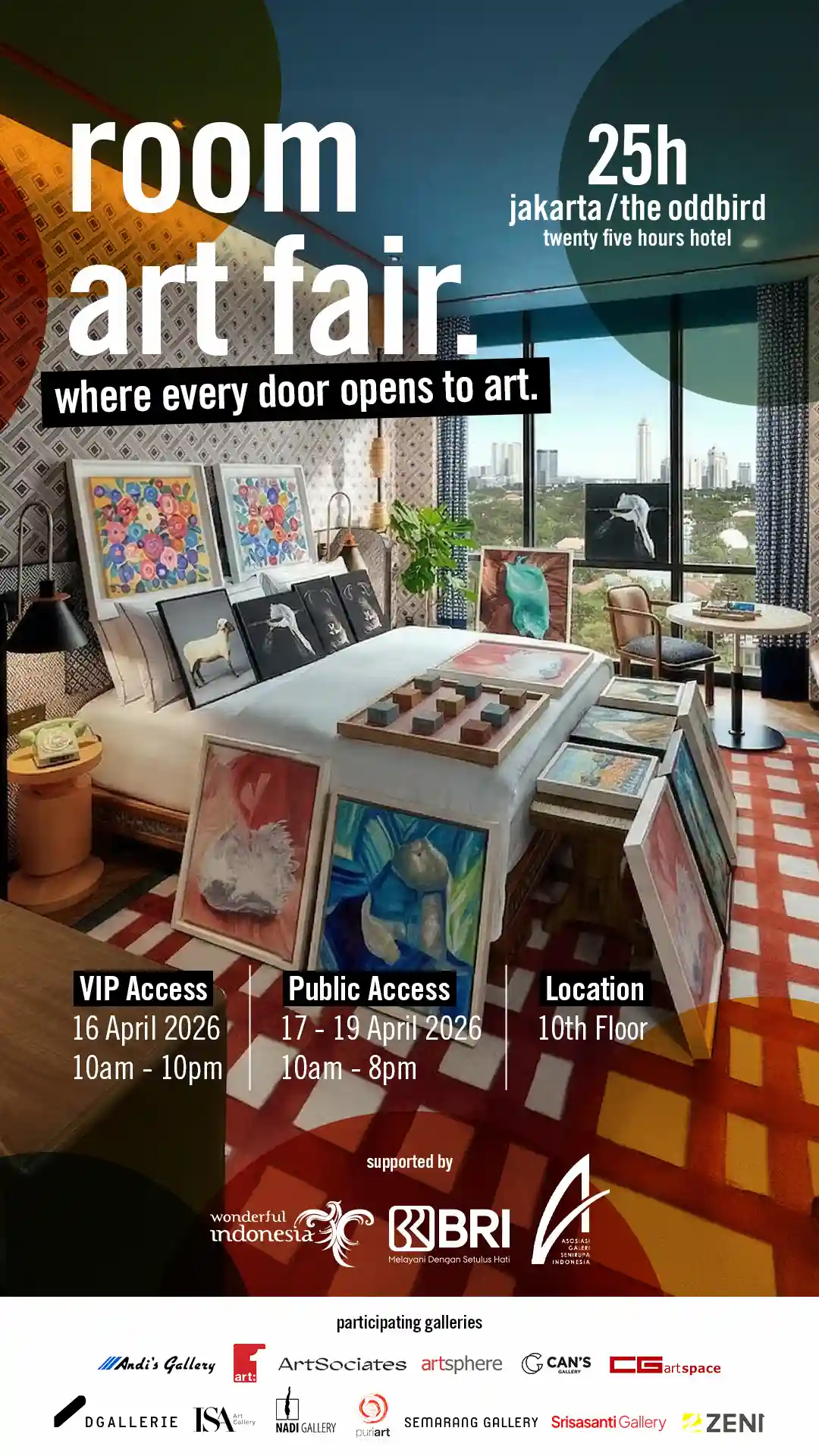 “At 25hours Hotel The Oddbird, we see the hotel as a place for exchange. Room Art Fair is our way of opening up the space, letting art sit closer to people, and making it part of everyday life, while also celebrating World Art Day in a way that feels relevant to urban life,” said Wibi Hananto, Asst. Director of Marketing Communications.