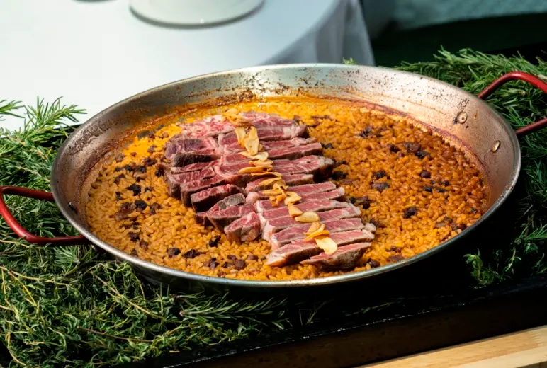 Paella De Erretxuleta A la Parrilla Con Alioli De Tuetano Y Chips De Ajo