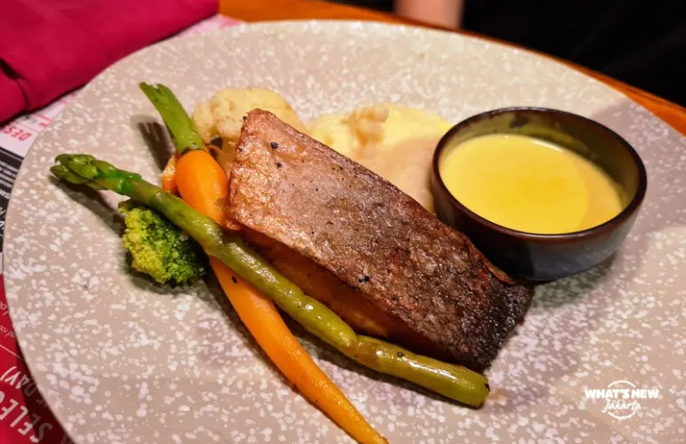 Not in the mood for red meat? The Pan-Seared Salmon is a solid detour into seafood territory. The salmon arrives juicy and tender, paired with baby carrots, asparagus, and gently burnt onion for a touch of smokiness. Mashed potatoes anchor the dish, while a saffron sauce adds a subtle layer of richness.