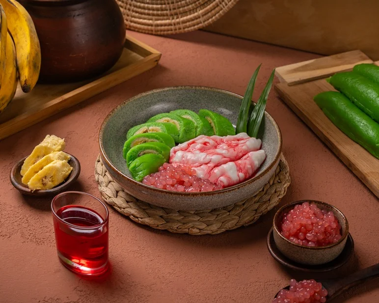 From Four Points by Sheraton Makassar, Executive Sous Chef Grace Natalia C. Titaheluw draws inspiration from the flavors of Sulawesi. Her Bubur Manado is an amalgamation of color and texture – rice porridge layered with seasonal vegetables, leafy greens, and herbs that turn the bowl into something far more robust than the word “porridge” suggests. For dessert, she presents Es Pisang Ijo, a Makassar classic where ripe bananas are wrapped in emerald-green rice flour dough, sliced into silky ribbons, and served beneath coconut milk and fragrant pandan syrup. Cool, creamy, and unmistakably tropical.