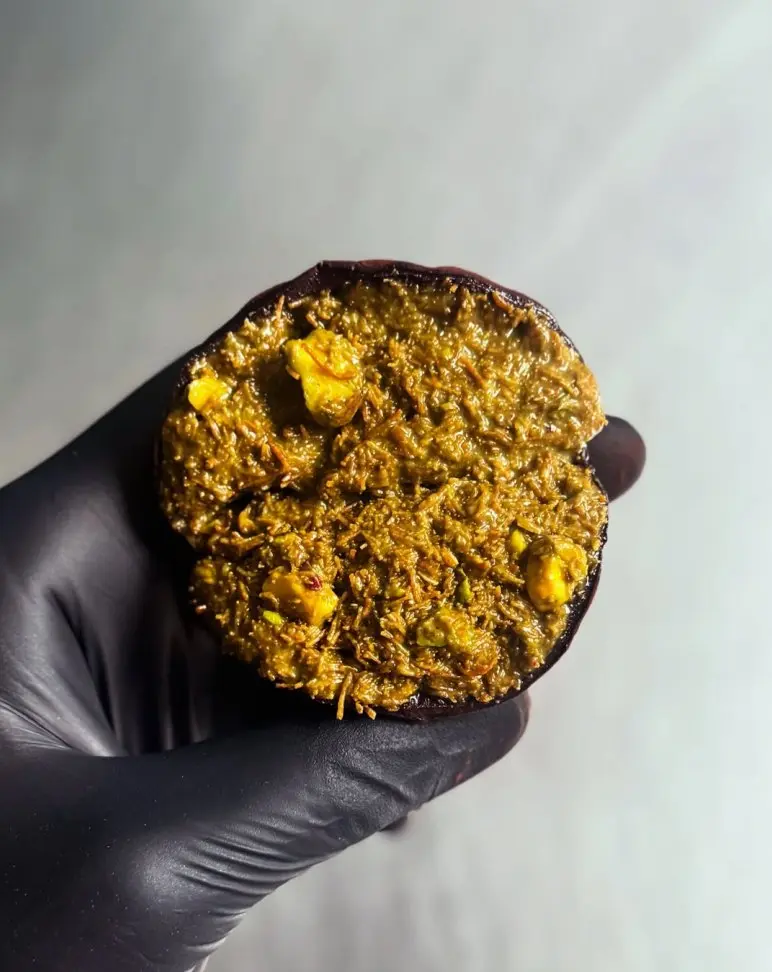 Soopsok Sweets, known for its beautifully crafted macarons and cakes, isn’t missing out on the trend with its take on the Dubai chewy cookie. Made with premium pistachios and crispy kataifi, wrapped in nougat and coated in dark cocoa, it delivers a rich mix of textures and flavours.