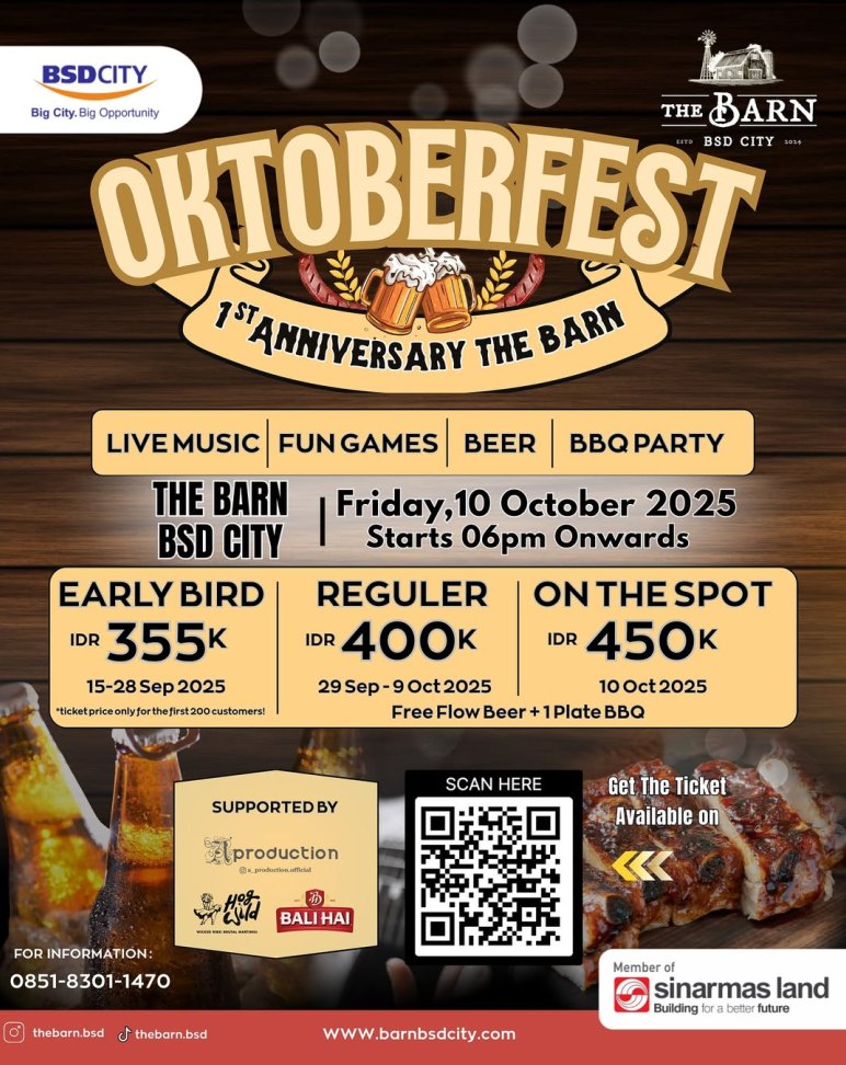 Join OKTOBERFEST – 1st Anniversary at The Barn with live music, fun games, a BBQ party, and of course, FREE FLOW BEER! Taking place at The Barn BSD City on Friday, October 10, 2025, starting from 6:00 PM onwards. Tickets are available at IDR 355K for Early Bird, IDR 400K for Regular, and IDR 450K for On the Spot. Nothing beats the perfect vibes of BBQ and beer, so don’t miss it! Tickets can be purchased by scanning the QR code on the poster. For more information, contact +6285183011470.