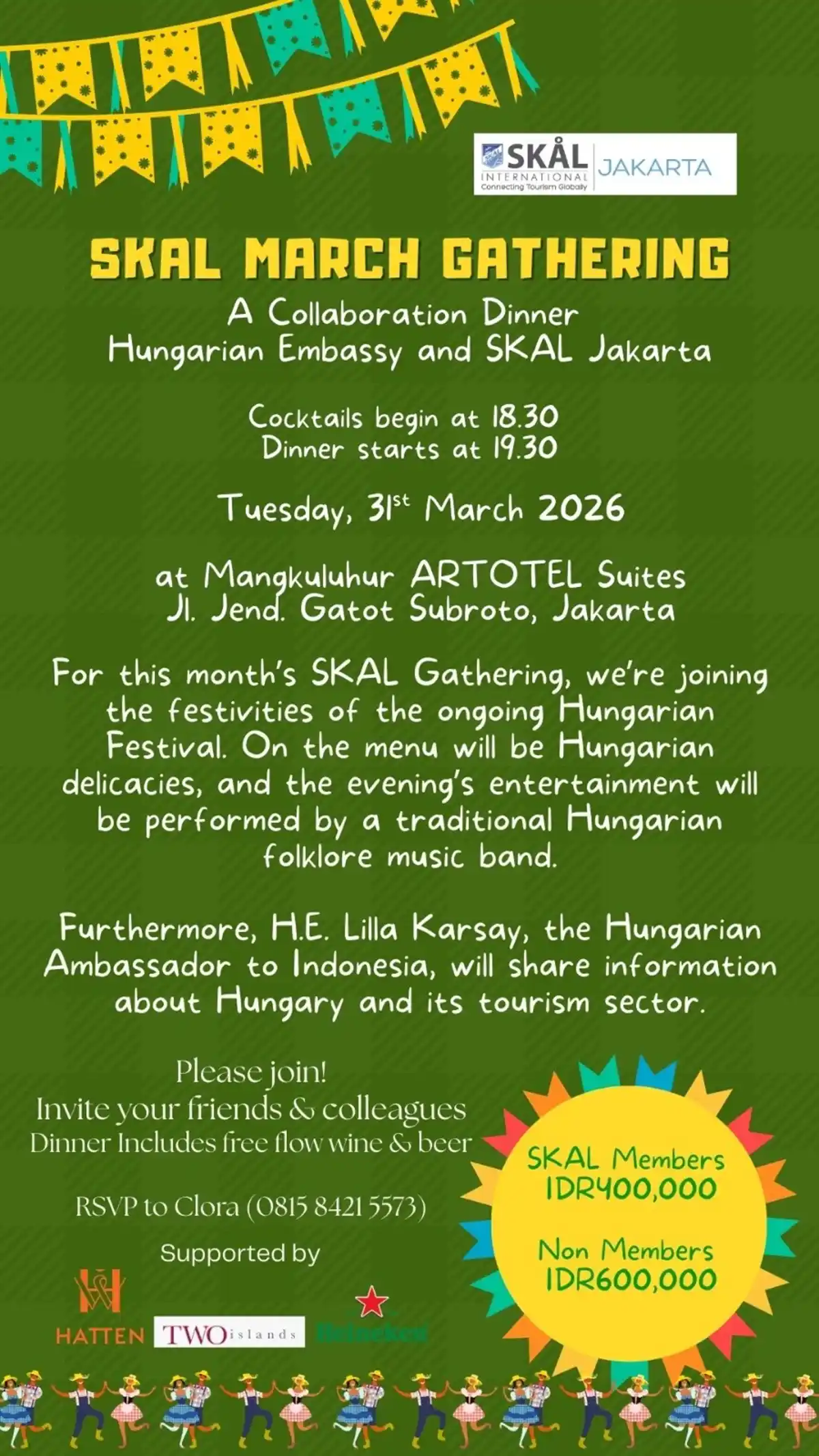 SKAL March Gathering presents a special collaboration dinner with the Hungarian Embassy, celebrating the ongoing Hungarian Festival. The evening features authentic Hungarian delicacies accompanied by live entertainment from a traditional Hungarian folklore music band.