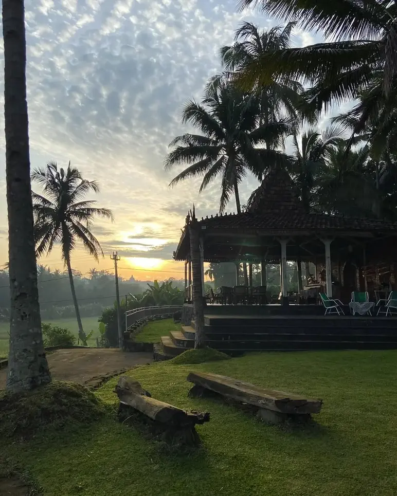 D’Cikalan Borobudur is a charming, traditional-style café and restaurant that offers a rare and direct view of the Borobudur stupas peeking through a sea of emerald rice paddies. Located just about one kilometer from the temple, this hidden gem is famous for its "Kopi Badhek"—a unique signature coffee mixed with fresh coconut sap—which guests can enjoy while watching locals climb nearby coconut trees. With its classic Javanese pendopo architecture and affordable local snacks like fried bananas, it provides one of the most authentic and peaceful sunrise or sunset spots for travelers wanting to see the temple from a serene, rural perspective.