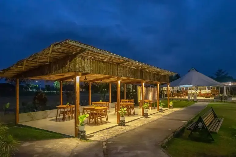 Lamen Restaurant is a sophisticated addition to the Borobudur dining scene, blending elegant colonial architecture with classic Javanese design elements. Located just minutes from the temple on Jalan Badrawati, this restaurant offers a versatile setting with indoor, outdoor, and terrace seating that provides serene views of the surrounding rice fields and distant hills. It is an ideal spot for a sunset dinner, serving a diverse menu that ranges from authentic Indonesian heritage dishes to international favorites like artisan pizza and steaks, all delivered with professional service in a tranquil, manicured garden environment.