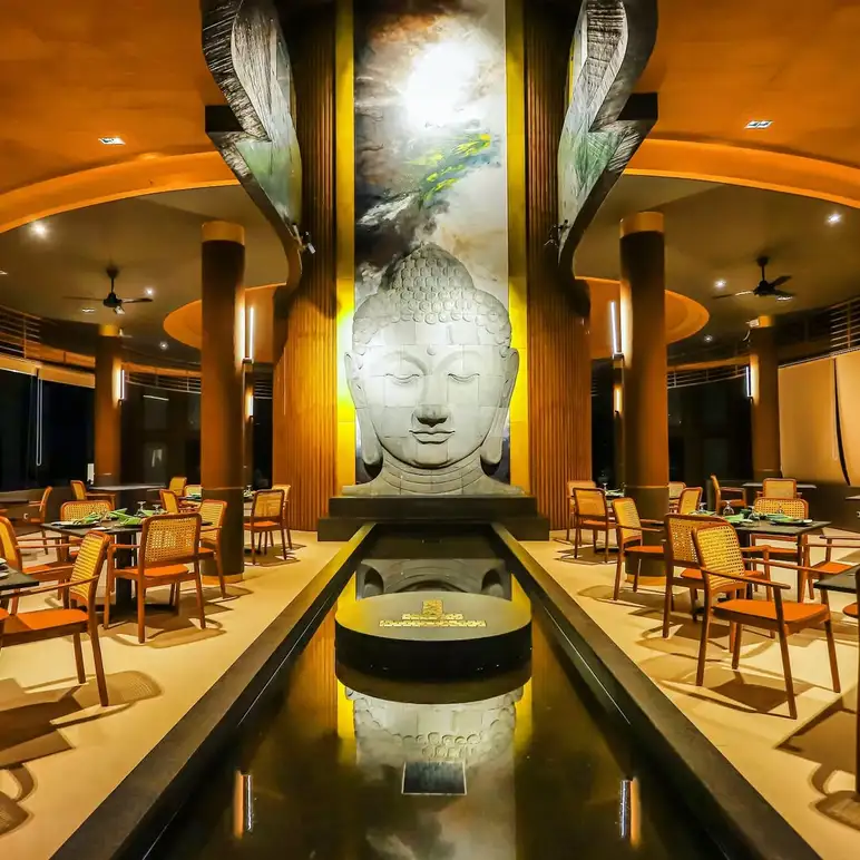 Stupa Restaurant, part of the Plataran Borobudur complex, is an open-air wooden pavilion that offers a quintessential Javanese dining experience with a direct view of the Borobudur Temple and lush rice paddies. Surrounded by teak forests and the majestic Menoreh Hills, this restaurant specializes in authentic Indonesian heritage cuisine, such as Ayam Dharmawangsa and Nasi Goreng Keling. Its rustic yet elegant atmosphere makes it one of the most popular spots for a scenic lunch or a romantic "Golden Hour" dinner where guests can admire the temple’s silhouette as the sun sets.