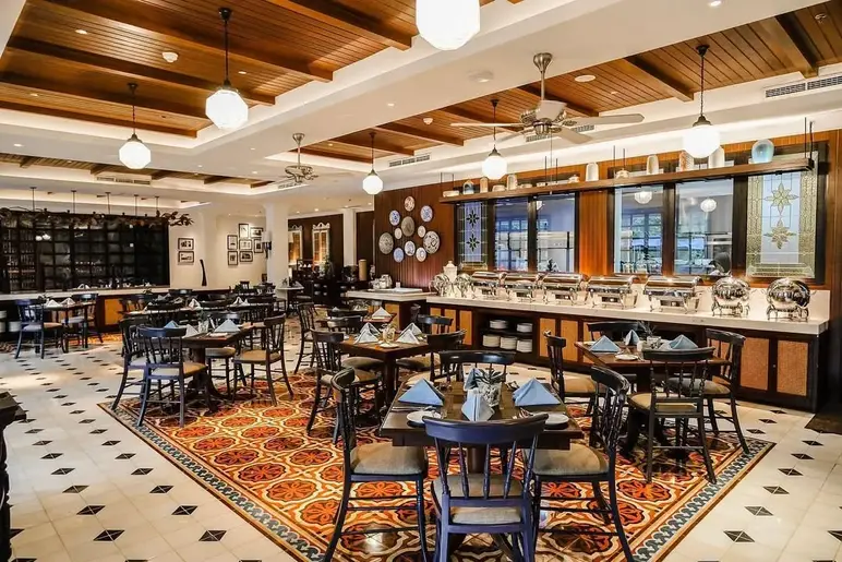 Patio Colonial, located within the prestigious Plataran Borobudur Resort & Spa, offers an elegant dining experience characterized by its grand Dutch-colonial architecture and direct views of the Borobudur Temple and Menoreh Hills. The restaurant provides a sophisticated, "old-world" atmosphere where guests can enjoy refined Indonesian and international dishes while overlooking the temple's iconic stupas peeking through the lush teak forest. Its combination of historical charm and serene garden vistas makes it a premier choice for those seeking a quiet, upscale retreat just a stone's throw from the monument.