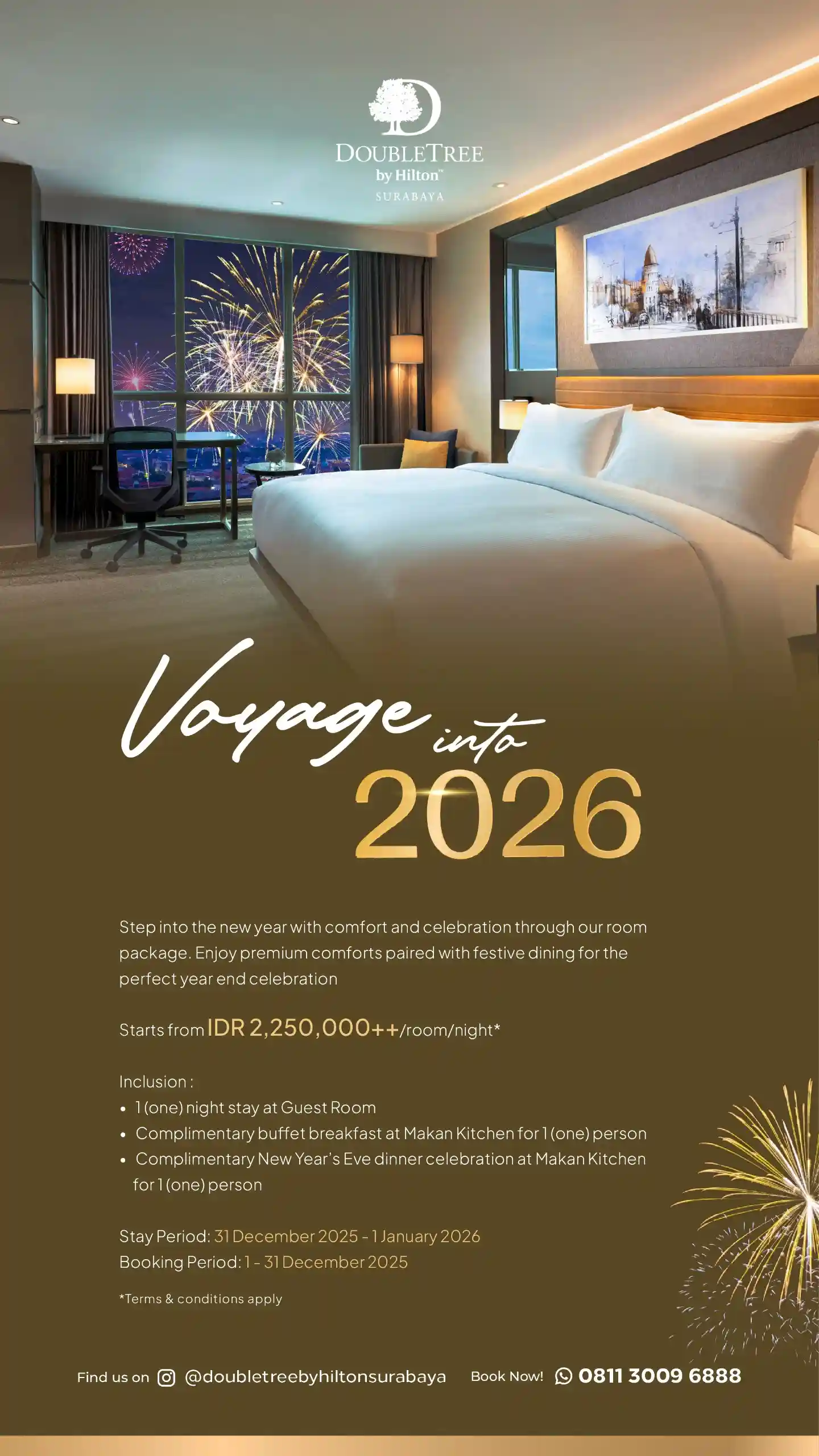 DoubleTree by Hilton Surabaya offers a warm and festive escape right in the center of the city. Their Voyage into 2026 package highlights a blend of comfort and celebration, complete with spacious guest rooms that overlook Surabaya’s glowing skyline. The interior feels modern and inviting, making it an ideal setting to watch city fireworks from a private space. Guests will enjoy a one night stay in a Guest Room, along with a complimentary buffet breakfast and a New Year’s Eve dinner celebration at Makan Kitchen for one person. The package begins from IDR 2,250,000++ per room per night, creating an accessible option for guests who want both convenience and festive dining. With a stay period from 31 December 2025 to 1 January 2026, the experience is designed to offer a lively yet relaxing transition into the new year.