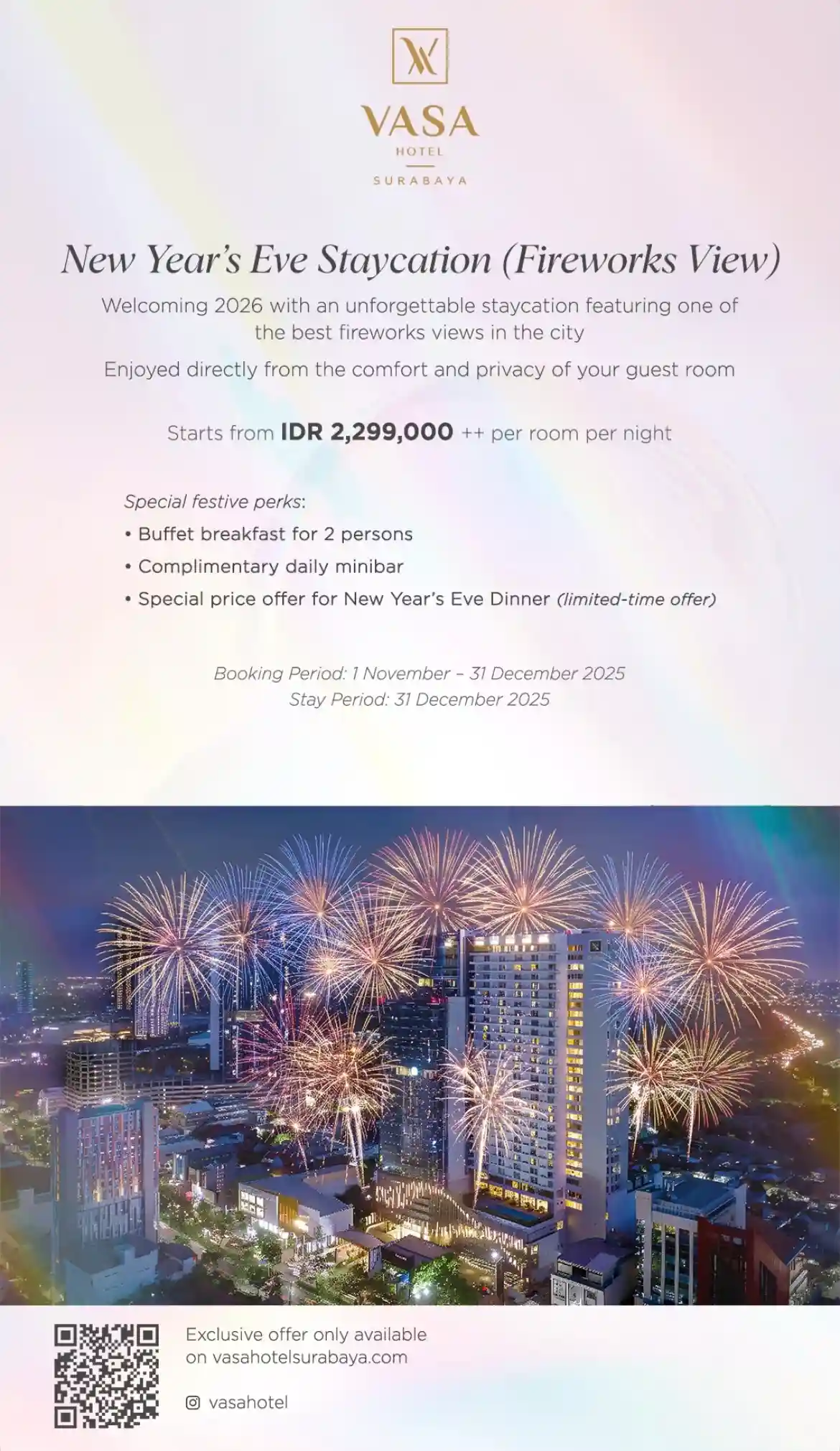 Vasa Hotel Surabaya offers one of the most unforgettable fireworks experiences in the city. With its towering height and expansive windows, guests can enjoy glowing skies filled with fireworks directly from their room. This package focuses on privacy, comfort, and a visually stunning New Year’s Eve moment. The staycation includes buffet breakfast for two, a complimentary daily minibar, and a special limited-time offer for New Year’s Eve Dinner. Starting from IDR 2,299,000++ per room per night, the deal is both elegant and approachable. The stay period is set for 31 December 2025, with bookings available from 1 November to 31 December 2025.