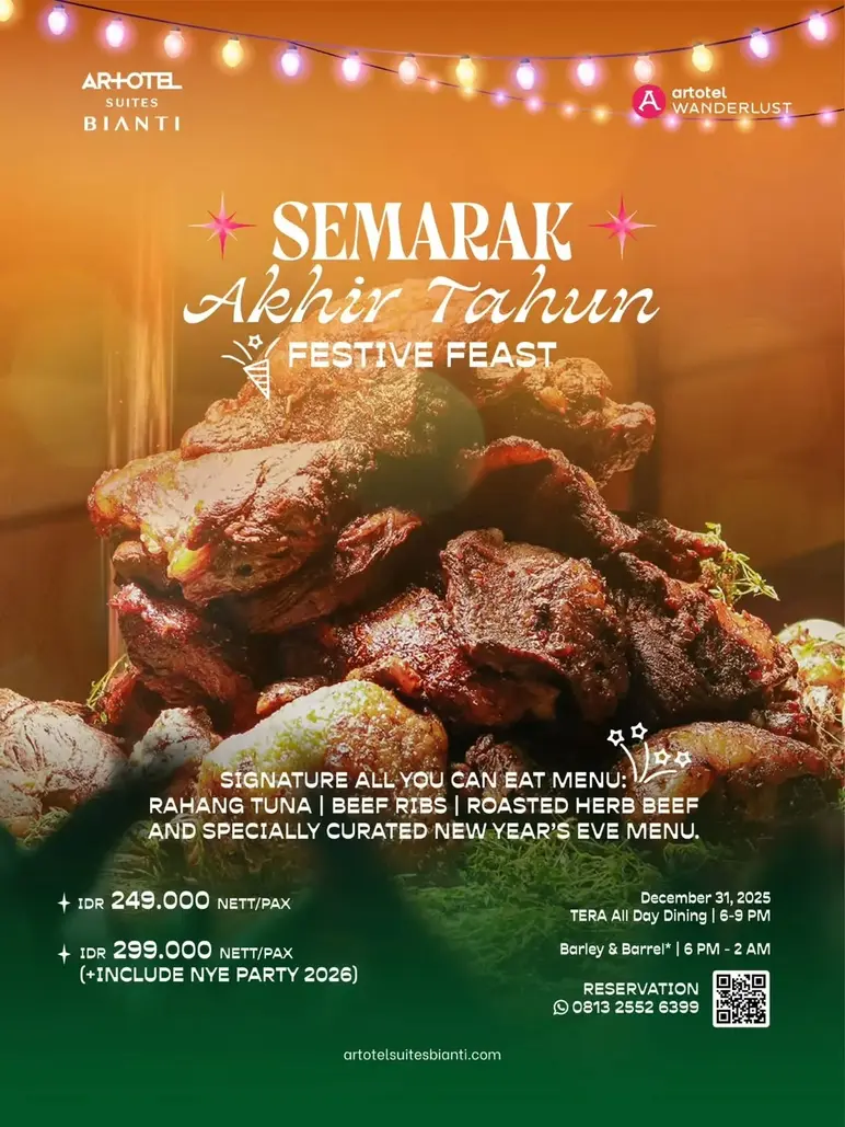 For guests who want to experience delicious dining, ARTOTEL also offers the Festive Feast, priced at IDR 249,000 nett per person and IDR 299,000 nett per person, including access to the New Year's Eve Party 2026. Festive Feast is presented with an All You Can Eat concept at TERA All Day Dining on December 31, 2025, from 6 p.m. to 9 p.m.