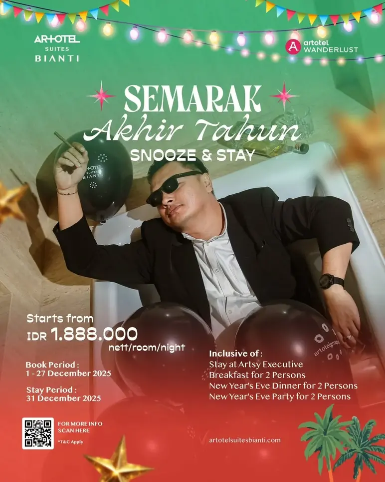 ARTOTEL Suite Bianti offers a year-end stay with the Snooze & Stay package, starting from IDR 1,888,000 nett per room per night, including a stay at Artsy Executive, breakfast for two, New Year's Eve Dinner for two, and a New Year's Eve Party for two. This package is available until December 27, 2025, with a stay period of December 31, 2025.