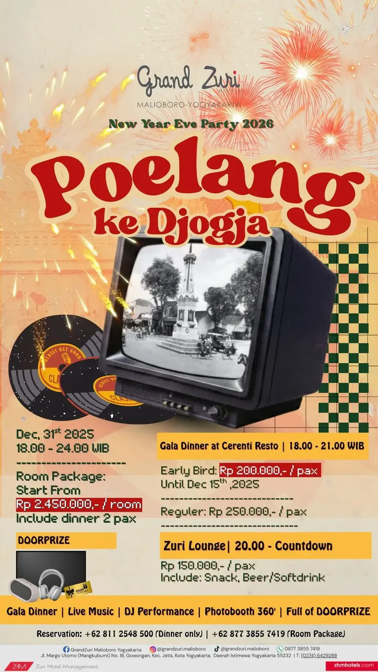 Grand Zuri presents a New Year's Eve experience with the theme "Poelang ke Djogja." On December 31, 2025, guests are invited to enjoy a stay package that can be obtained for IDR 2,450,000 per room, including dinner for 2 pax. For guests who only want to enjoy dinner, the Gala Dinner is held at Cerenti Resto from 6 pm to 9 pm for IDR 200,000 (Early Bird until December 15, 2025), while the normal price is IDR 250,000.