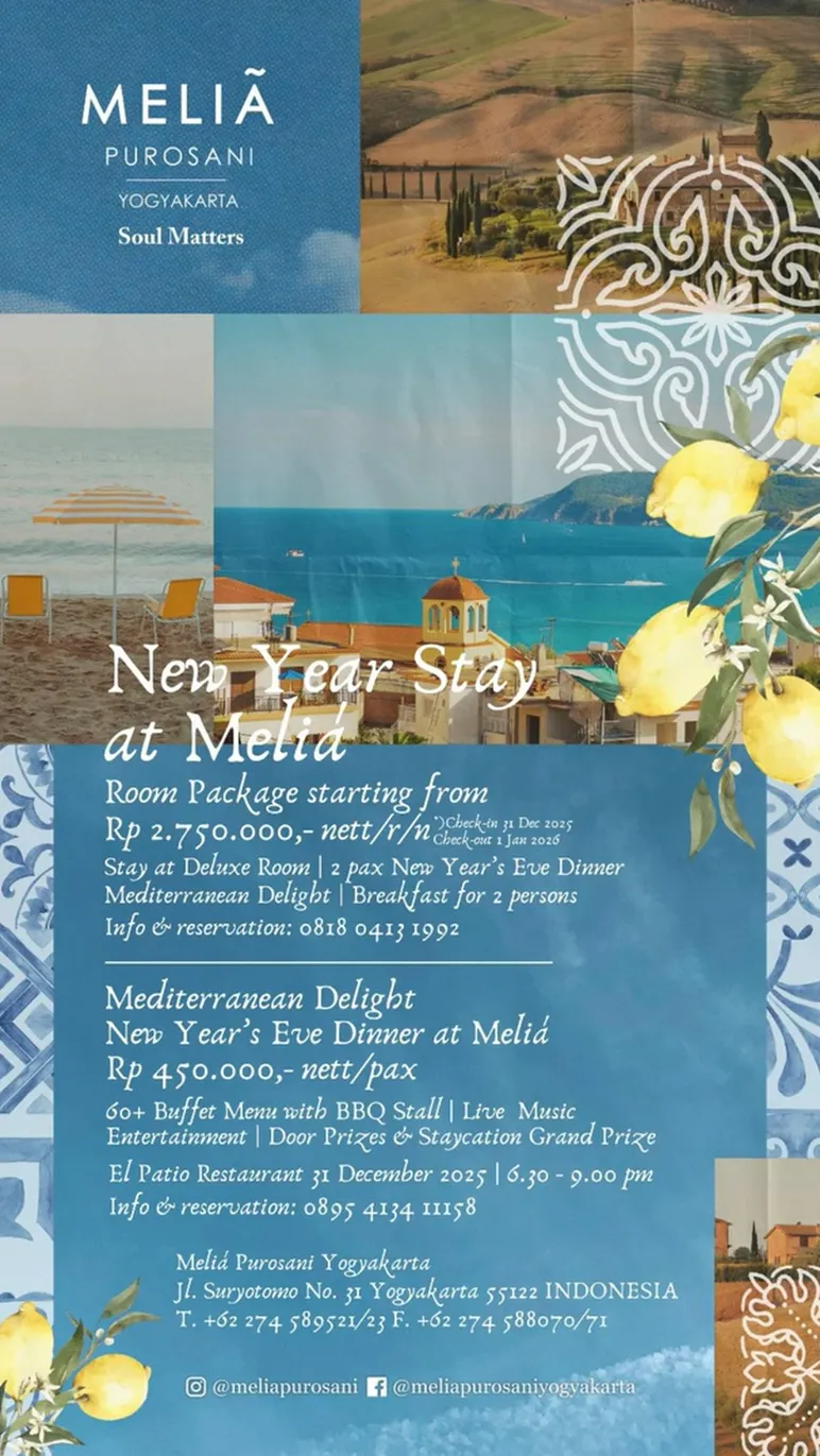 Meanwhile, guests who wish to enjoy dinner at Meliá Purosani Yogyakarta can enjoy the Mediterranean Delight New Year's Eve Dinner for IDR 450,000 net/pax. This dinner will be held at the Patio Restaurant on December 31, 2025, from 6:30 to 9:00 PM.