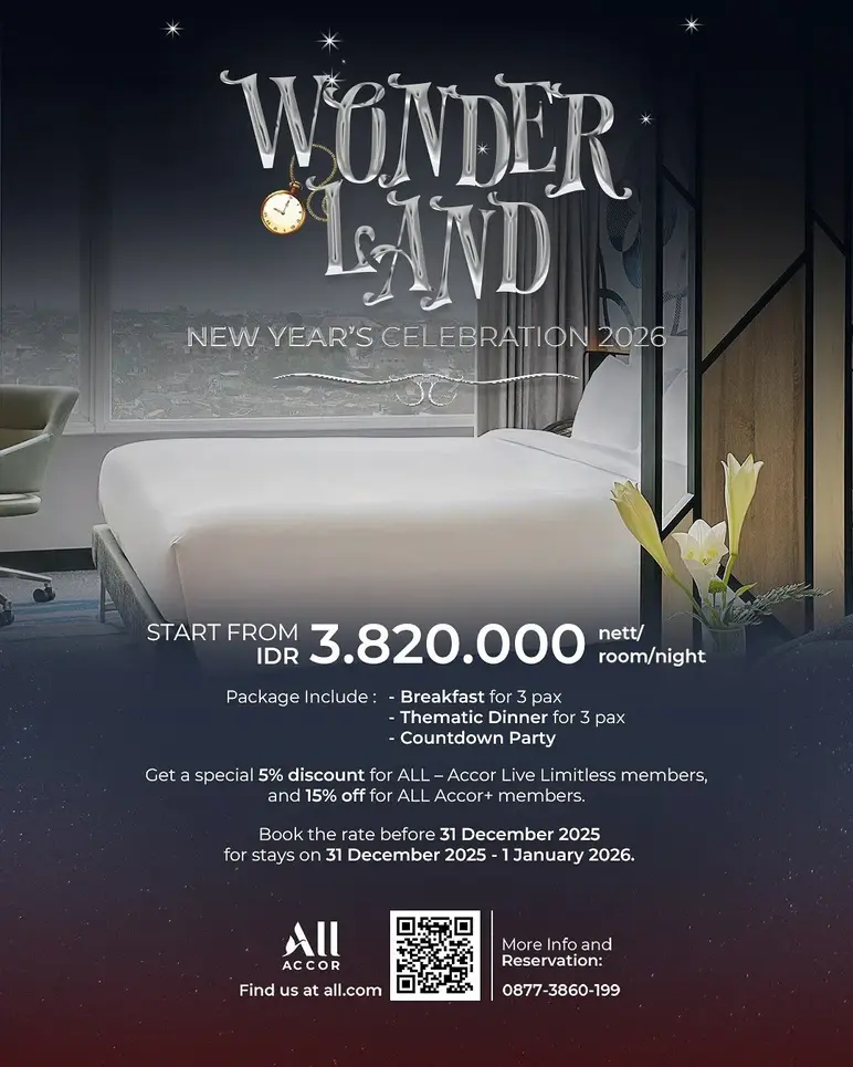 For guests who want to stay overnight, room packages can be booked starting from IDR 3,820,000 nett per room per night. This package includes breakfast for 3 people, a thematic dinner for 3 people, and a countdown party. Guests can also get a special 5% discount for ALL-Accor Live Limitless members and 15% for ALL-Accor+ members. This package can be booked until December 31, 2025, for the stay period December 31, 2025 - January 1, 2026.