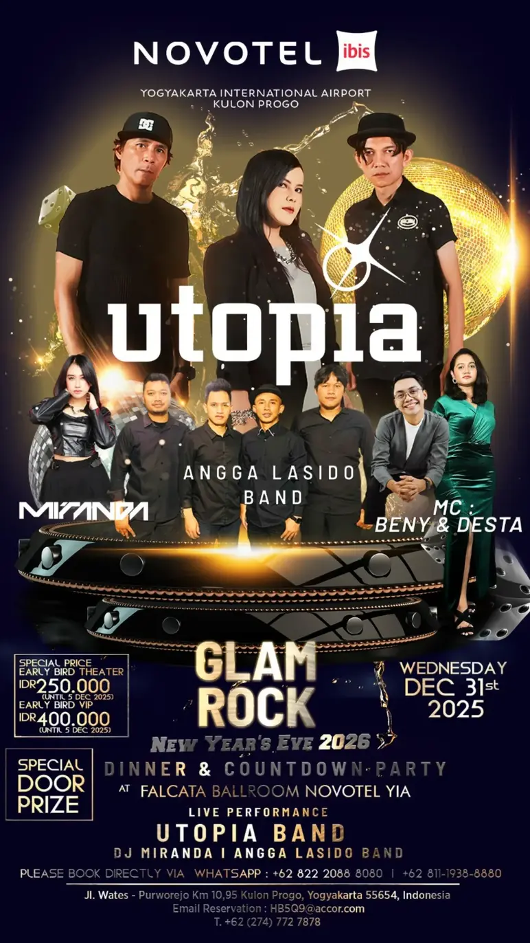 Novotel and ibis present Glam Rock New Year's Eve 2026. Guests are invited to enjoy an All-You-Can-Eat Dinner & Countdown Celebration, with prices starting from IDR 250,000 nett per person (Early Bird rate until December 5, 2025). Stay packages are offered at prices starting from IDR 1,500,000 nett, which includes one night's stay, dinner, countdown access, and breakfast for two people.