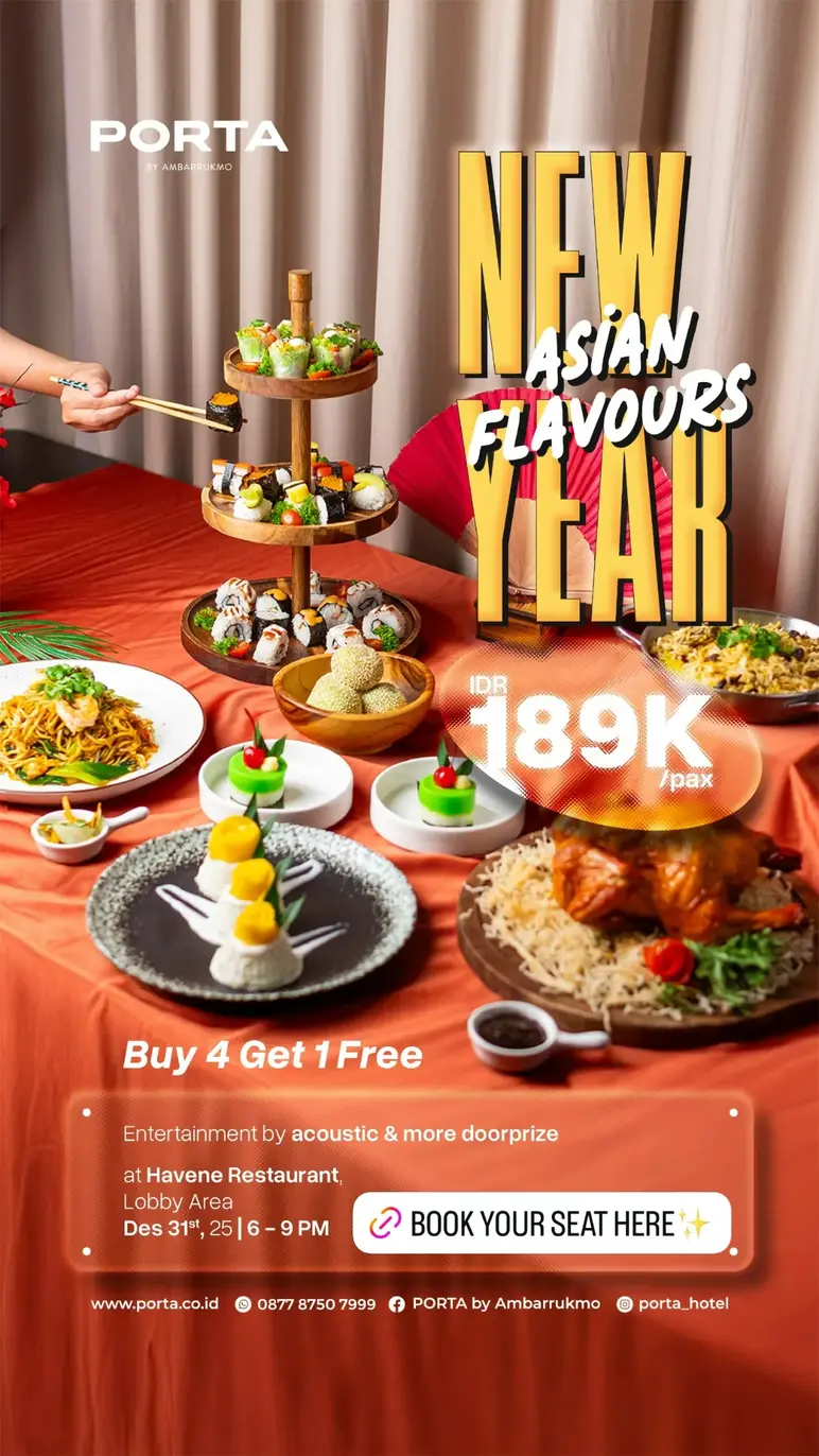 PORTA by Ambarrukmo is offering a New Year's Eve Asian Flavors dinner package at Havene Restaurant on December 31, 2025, from 6 p.m. to 9 p.m. To enjoy this package, guests only need to pay IDR 189,000 per person, with a buy 4 get 1 free promotion.