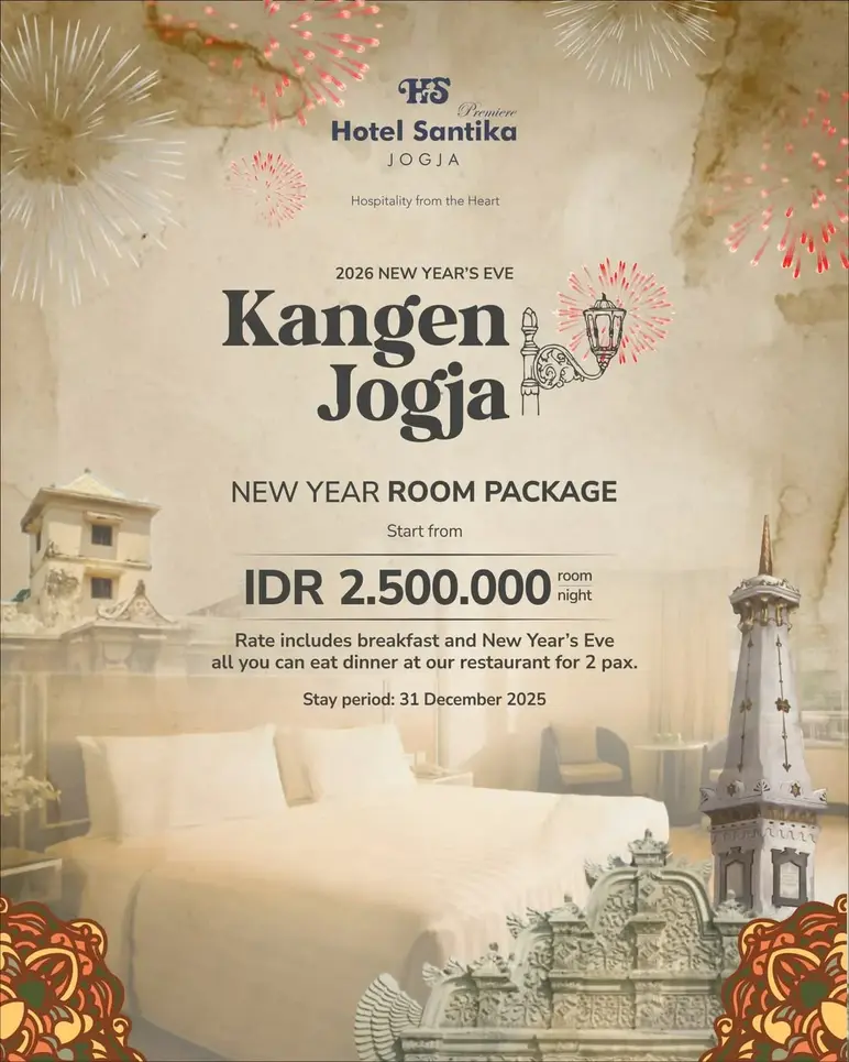 Hotel Santika is celebrating New Year's with the "Kangen Jogja" (Love Jogja) package, which includes a room and dinner package. Room packages start at IDR 2,500,000 per room per night, including breakfast and dinner for two people on December 31, 2025.