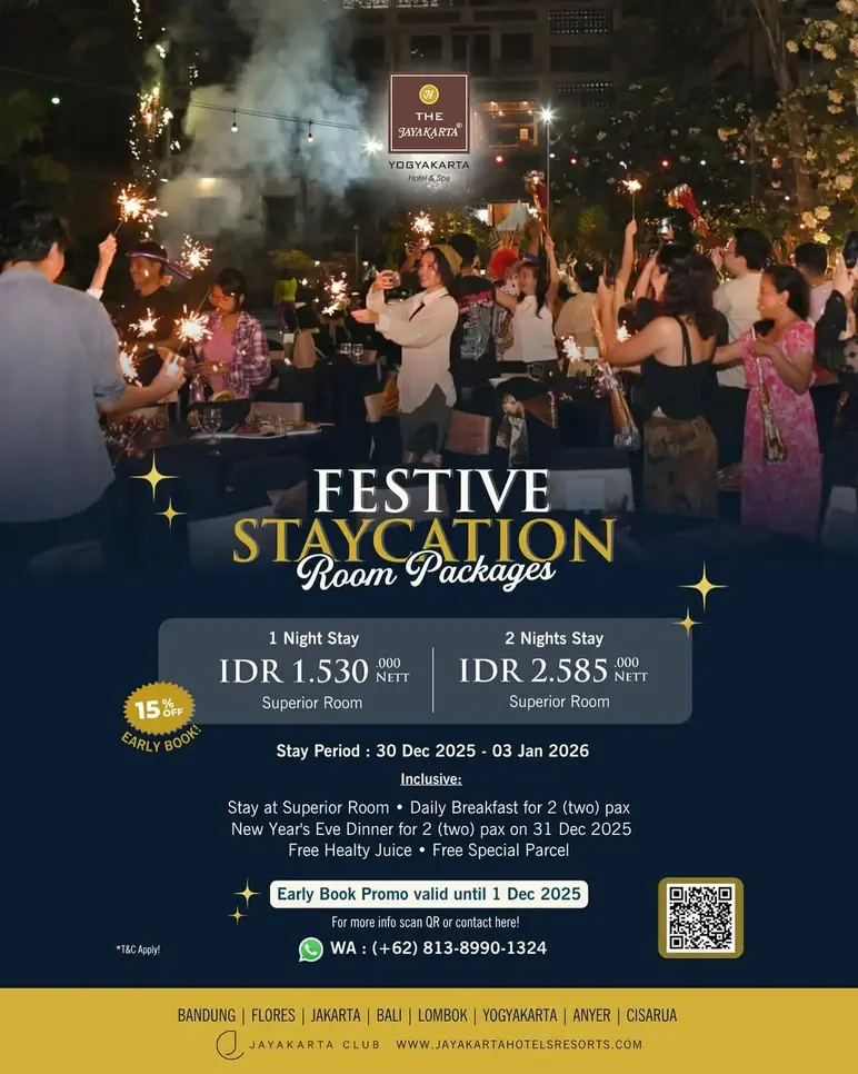 The Jayakarta presents a Festive Staycation to welcome a more meaningful New Year. Starting from IDR 1,530,000 nett to IDR 2,585,000 nett, including a stay in a Superior Room, breakfast for 2 pax, New Year's Eve Dinner for 2 pax on December 31, 2025, free healthy juice, and a free special parcel. For early bookings until December 1, 2025, guests can get a 15% discount with a stay period from December 30, 2025, to January 3, 2026.