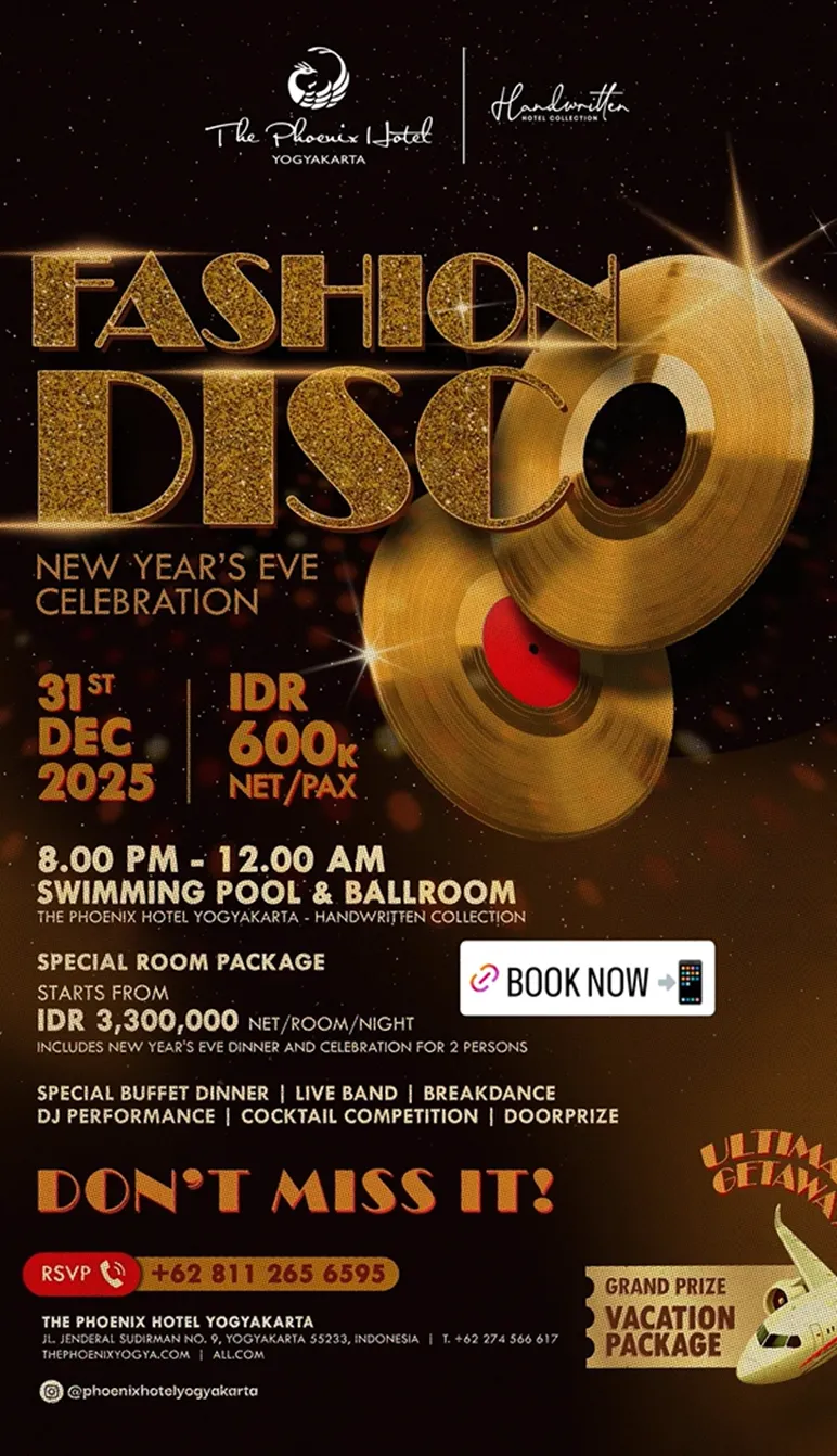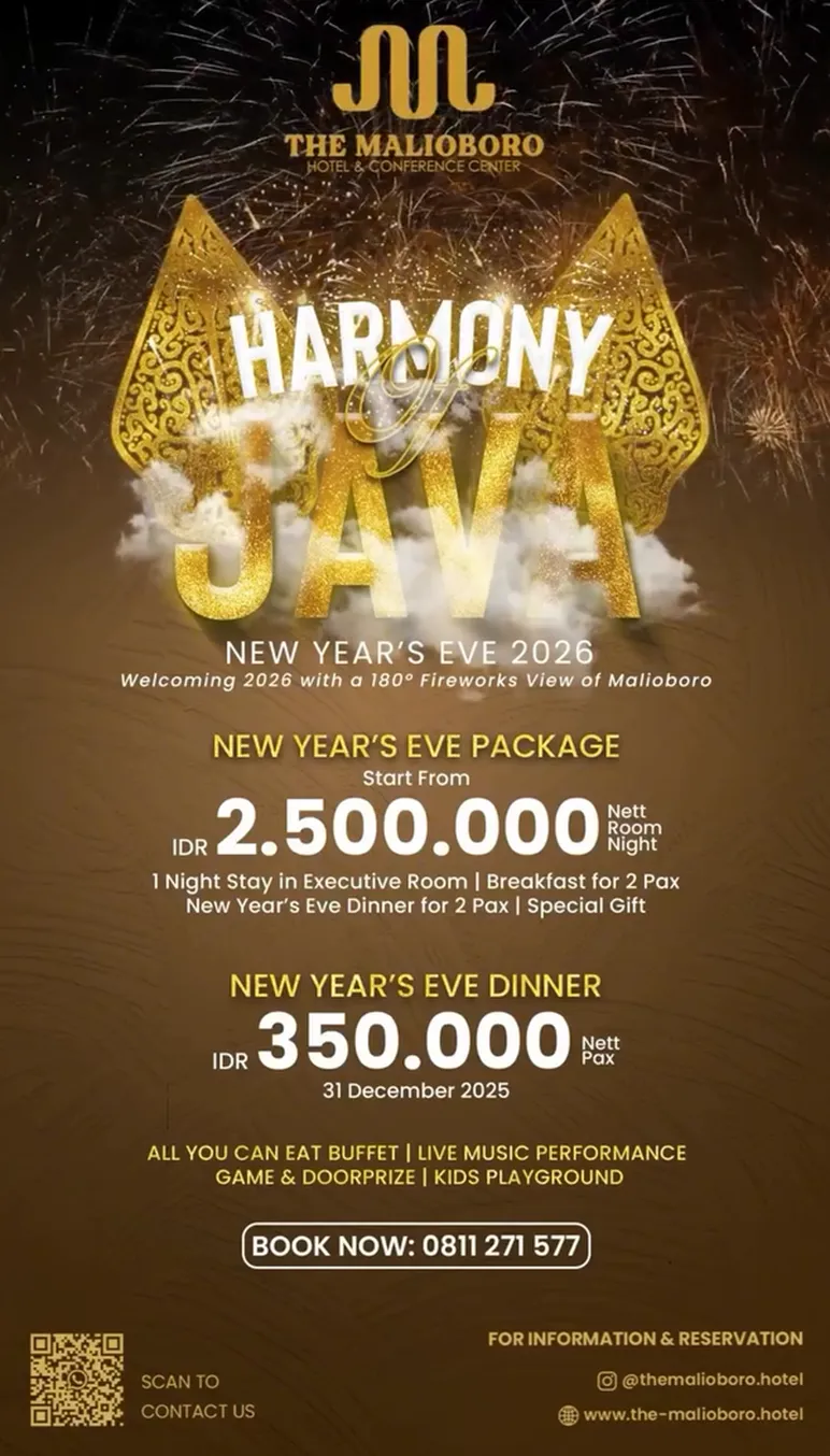 The Malioboro Hotel presents a New Year's celebration entitled "Harmony of Java." This package is offered at IDR 2,500,000 nett per room per night, including accommodation in an Executive Room, breakfast for 2 pax, New Year's Eve dinner for 2 pax, and a special gift. Meanwhile, the New Year's Eve dinner package can be obtained at IDR 350,000 nett per pax on December 31, 2025, where guests will be welcomed with an All You Can Eat buffet, live music performance, games, door prizes, and a kids' playground.