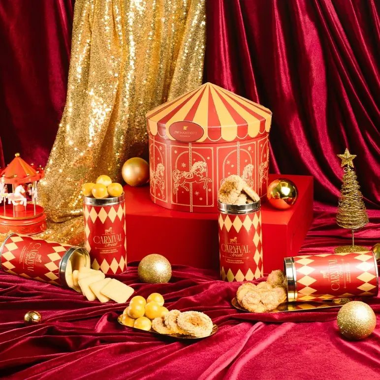 Sheraton’s “Unwrap the Season of Giving” collection features two premium festive hampers. Starlight Sweet includes four selections of cookies and a macaron set, while Midnight Sip offers a bottle of wine, cookies, and pralines. Crafted for meaningful giving, both sets come with an early-bird 20% discount until 10 December.