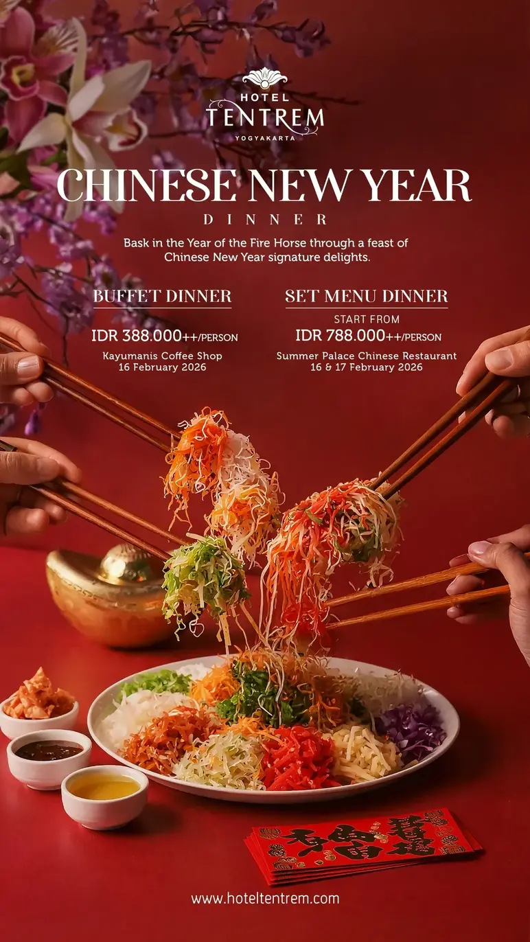 Hotel Tentrem offers two Chinese New Year Dinner packages. Guests can enjoy a buffet dinner at Kayumanis Coffee Shop for IDR 388,000++ per person on February 16, 2026, while a set menu dinner starts at IDR 788,000++ per person at Summer Palace Chinese Restaurant on February 16 and 17, 2026.