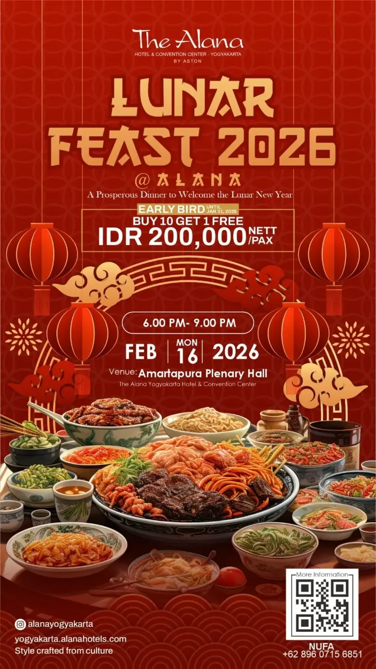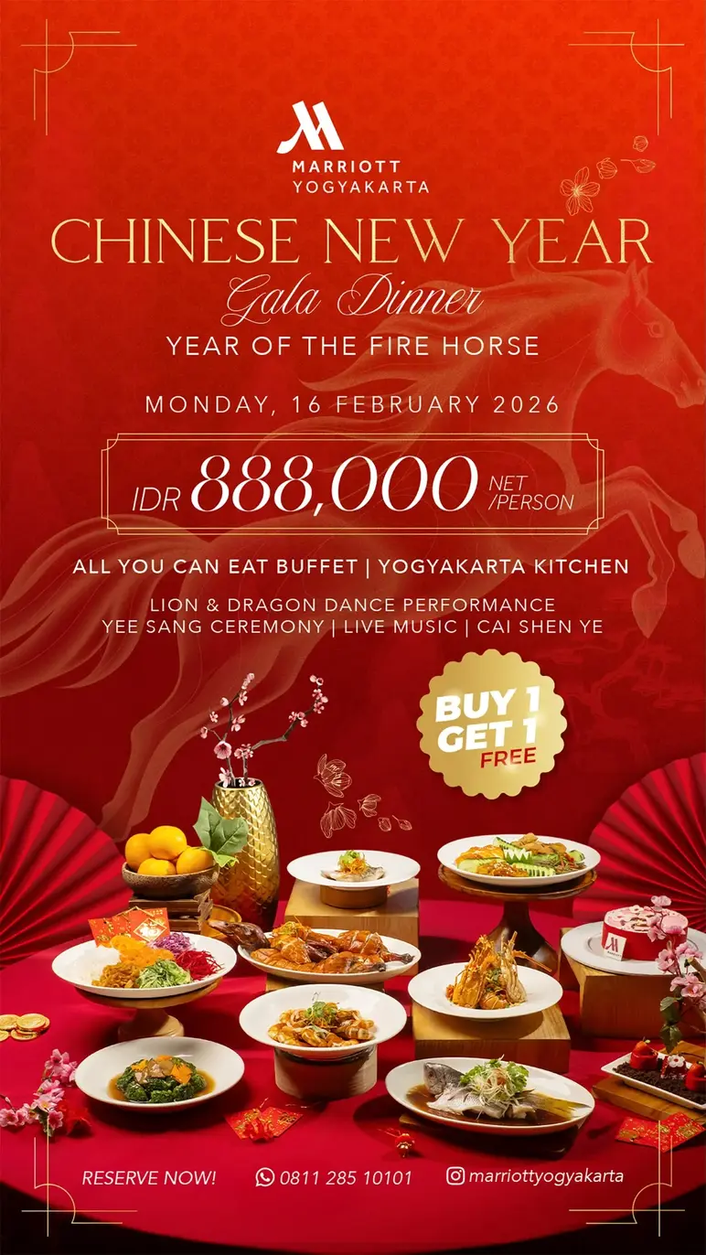 Yogyakarta Marriott Hotel is hosting a Chinese New Year Gala Dinner for the Year of the Fire Horse on February 16, 2026, priced at IDR 888,000 nett/person. Held at Yogyakarta Kitchen, guests can enjoy an all-you-can-eat buffet with a lion and dragon dance performance, yee sang ceremony, cai shen ye, and live music. An attractive buy-one-get-one-free offer is also available.