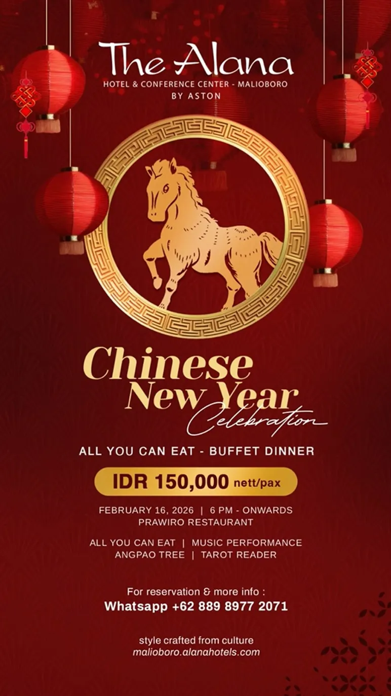 The Alana Malioboro presents a family dining experience with an all-you-can-eat buffet dinner for IDR 150,000 net per person on February 16, 2026, from 6 p.m. to closing, at Prawiro Restaurant. Guests can enjoy this dinner accompanied by a music performance, a red envelope tree, and a tarot reading.
