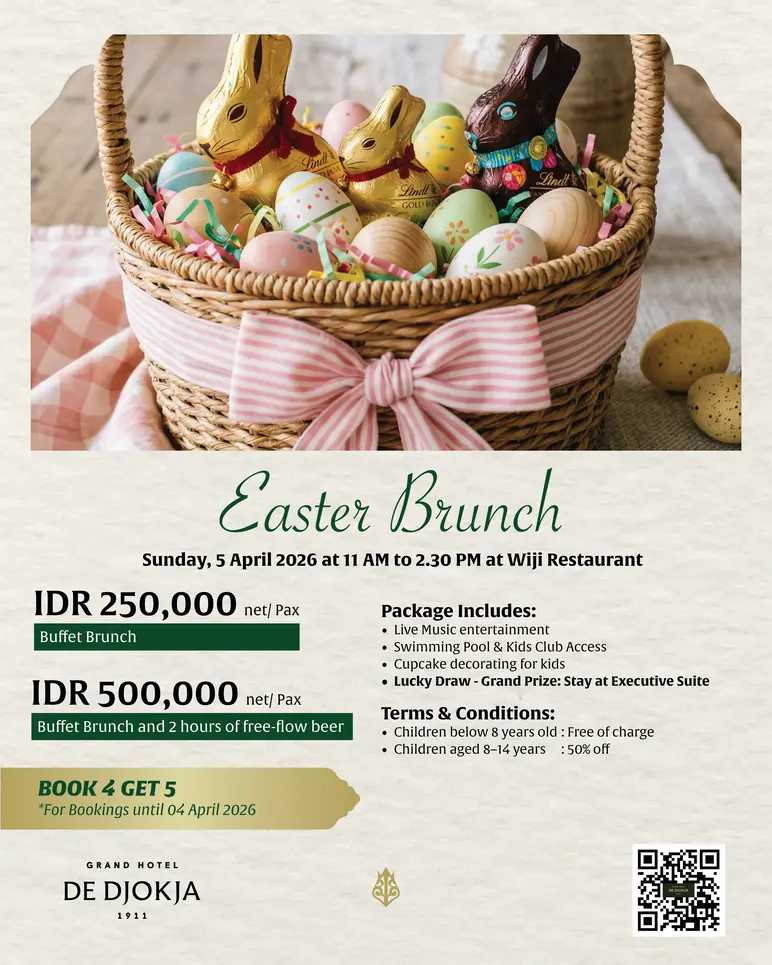 Grand Hotel De Djokja presents an Easter Brunch experience at Wiji Restaurant on Sunday, April 5, 2026. Buffet Brunch is offered at IDR 250,000 nett/pax, consisting of live music entertainment, swimming pool & kids club access, cupcake decoration for children, and a lucky draw with the main prize of staying in the Executive Suite. There is also a Buffet Brunch and 2 hours of free-flow beer offered at IDR 500,000 nett/person.