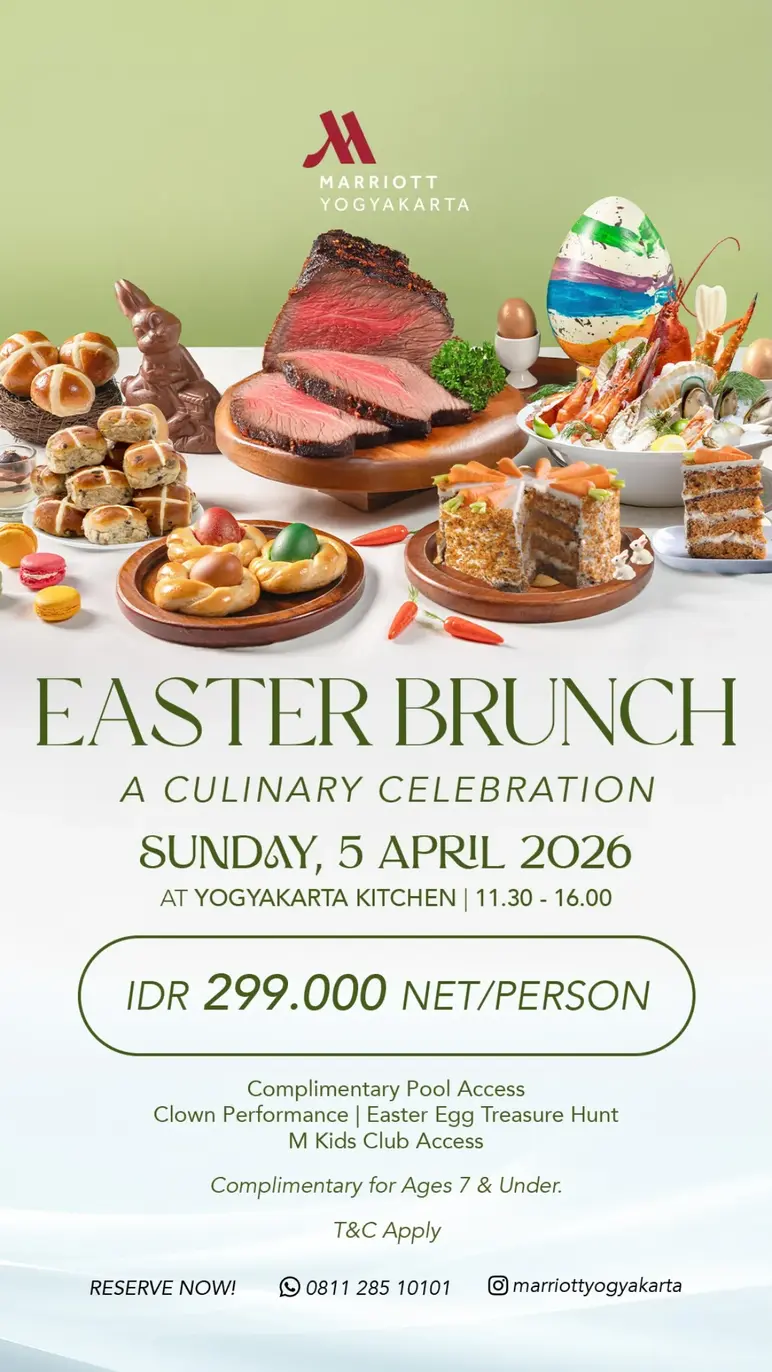 Marriott presents Easter Brunch on Sunday, April 5, 2026, at Yogyakarta Kitchen, from 11:30 a.m. to 4:00 p.m. This experience is offered at IDR 299,000 nett/person, consisting of complimentary pool access, a clown performance, an Easter egg treasure hunt, and M kids club access.