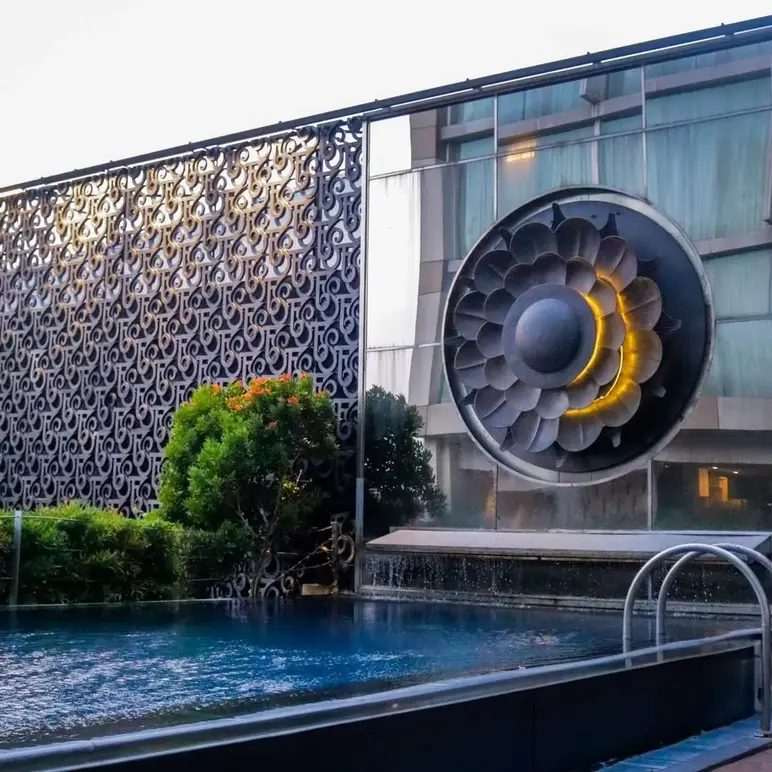 The Yogyakarta Marriott Hotel boasts a large and luxurious outdoor infinity pool that is highly regarded as one of the best in the city for its size and elegance. The pool is designed to offer a view and features a plunge pool and a shallow end, catering to all ages. It is complemented by an extensive surrounding deck for relaxation, the convenience of the Splash Pool Bar, and is integrated with the hotel's wellness facilities, including a spa and a 24-hour fitness center.