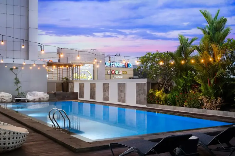The Swiss-Belboutique Yogyakarta is known for having a chic and highly-rated rooftop pool that offers guests a beautiful elevated view of the city, making it a fantastic spot for a relaxing dip and enjoying the ambiance. This outdoor swimming area is part of the luxurious Chadis Rooftop & Pool Bar, providing a modern, vibrant setting with comfortable seating and the convenience of drinks and live entertainment nearby.