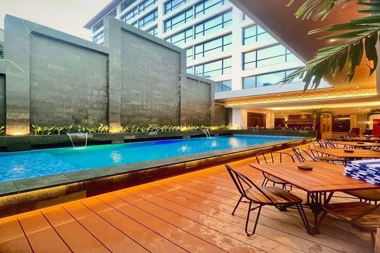 The Grand Mercure Yogyakarta Adi Sucipto features a well-regarded outdoor swimming pool set in a relaxing area that includes sun loungers and is surrounded by lush gardens. The pool is praised for its clean and tranquil environment and is also complemented by a separate children's pool and the convenience of the on-site Purple Restaurant, located semi-outdoors right by the water, offering views and dining right from the pool deck.