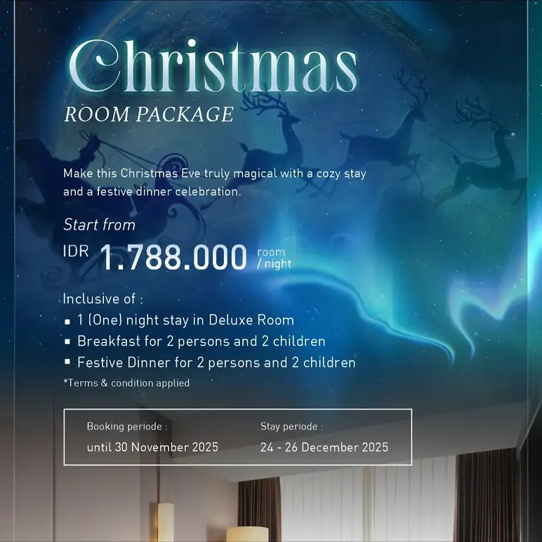 Enjoy a warm Christmas Eve with your loved ones with the Christmas Room Package starting from IDR 1,788,000/night (early bird rates). Includes 1-night stay in a Deluxe Room