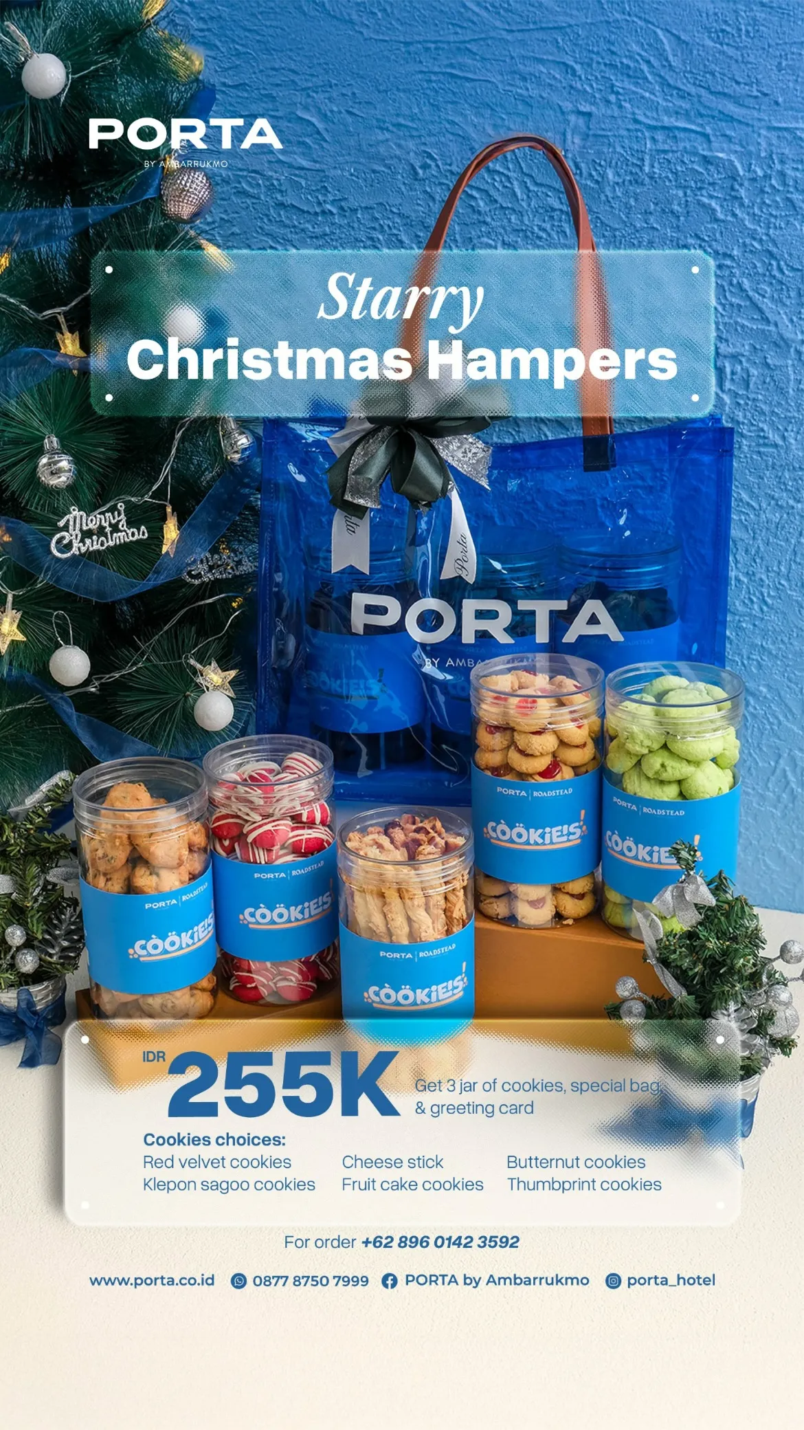 PORTA by Ambarrukmo presents Starry Christmas Hampers for IDR 255,000, including 3 jars of cookies, a special bag, and a greeting card.