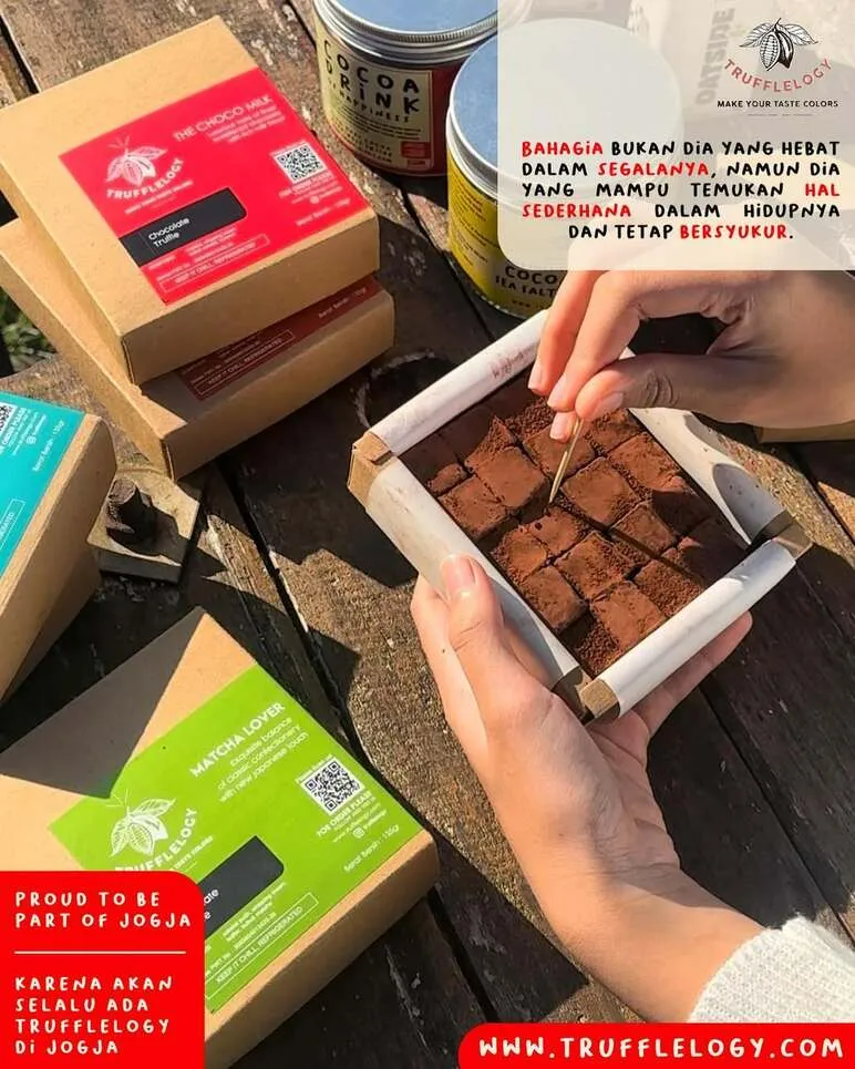 Trufflelogy Choco Factory Jogja is the ultimate destination for those who crave the melting, velvety texture of premium chocolate truffles. Known for its signature "Box of Happiness," this shop specializes in handcrafted, ganache-based delights, including the intense Dark Light, the creamy Matcha Lover, and the aromatic Choco Rum (non-alcoholic). With its sleek, modern branding and aesthetic café atmosphere, Trufflelogy has become a favorite among younger crowds and gift-seekers seeking a high-end, "Nama-style" chocolate experience that rivals international brands while remaining proudly local to Yogyakarta.