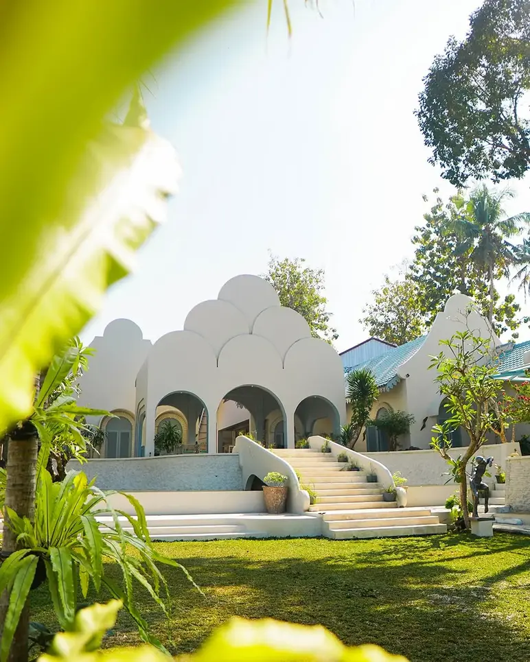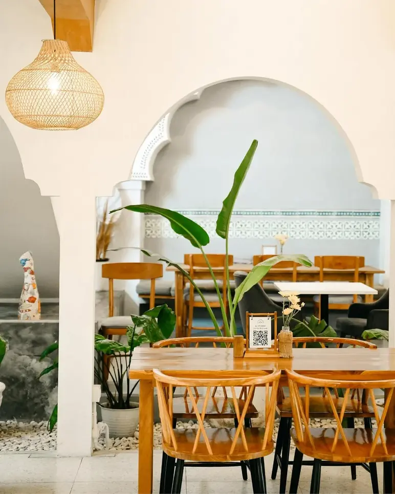 Champa Jogja is a Mediterranean-inspired oasis that offers a refreshing, aesthetic escape for modern families. With its striking white-and-blue architecture and lush garden setting, the restaurant provides an "Instagrammable" yet relaxed environment where children can enjoy a dedicated outdoor playground while parents unwind in breezy, open-air seating. The menu is a thoughtful blend of Western favorites, such as Wagyu burgers and steak, alongside authentic Javanese classics like Iga Bakar, ensuring a variety of flavors for all ages.