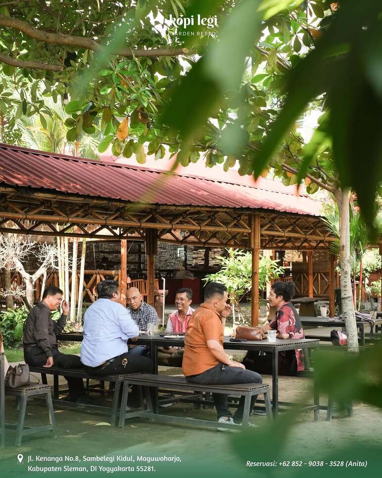 Kopi Legi is a serene, traditional retreat that offers families a refreshing "village-style" dining experience just a stone's throw from the airport. Designed as a spacious family restaurant, it features a charming open-air garden filled with bamboo structures and private wooden huts (saung), where parents can enjoy authentic Javanese buffet-style meals while taking in the beautiful sunset view. The relaxed, leafy environment provides children with ample space to roam safely, and the menu—featuring home-cooked classics like Sayur Lodeh and crispy Mendoan—is both budget-friendly and kid-approved.
