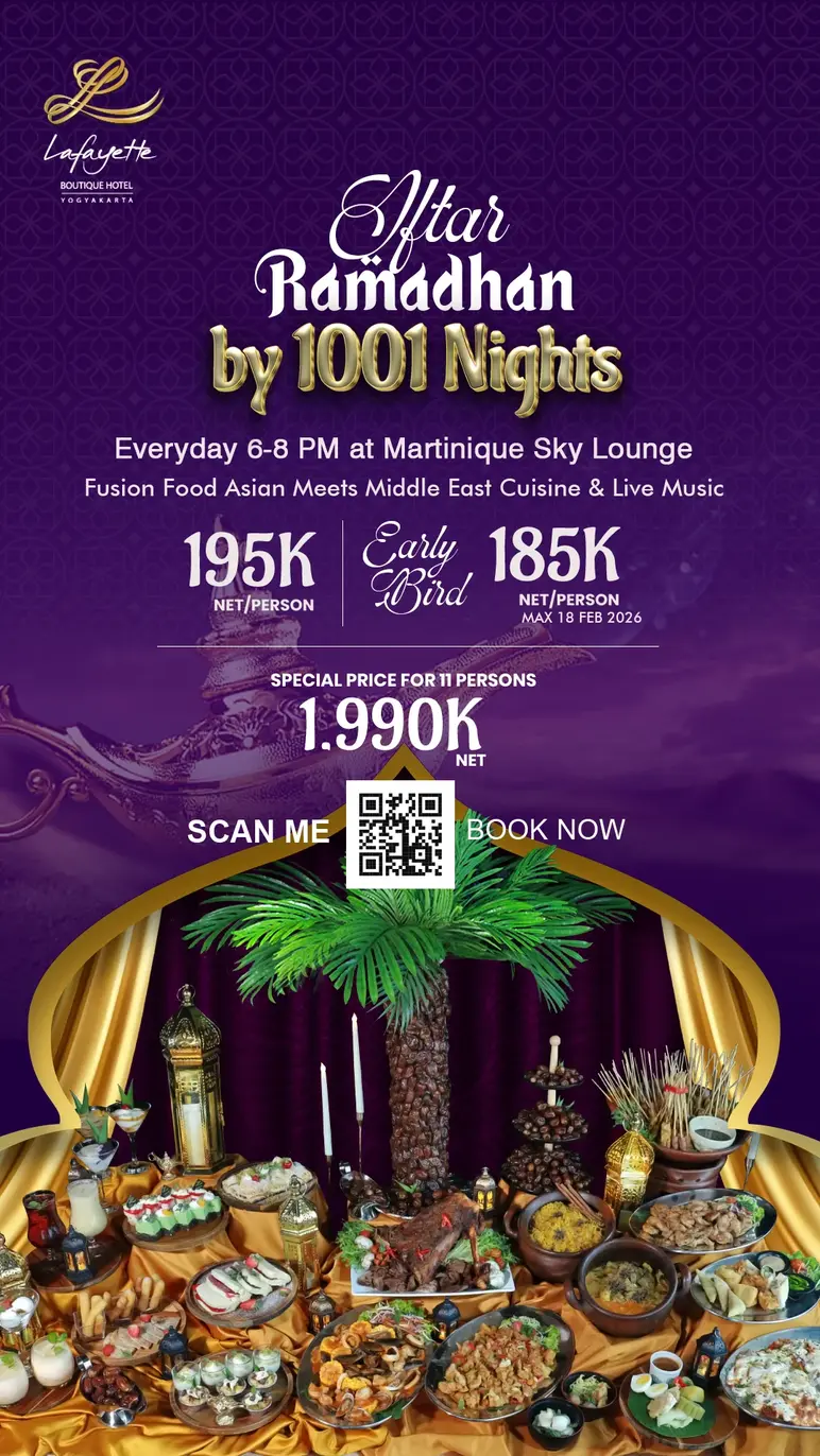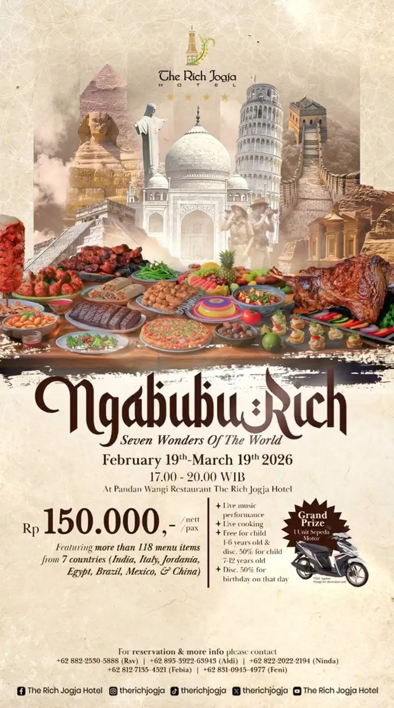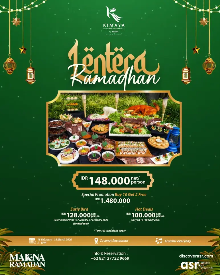 The Rich Jogja presents NgabubuRich as an iftar experience, which can be enjoyed from February 19 to March 19, 2026, starting from 5 pm-8 pm, at Pandan Wangi Restaurant, at a price of IDR 150,000 nett/pax (Buy 5 Get 1 Free).