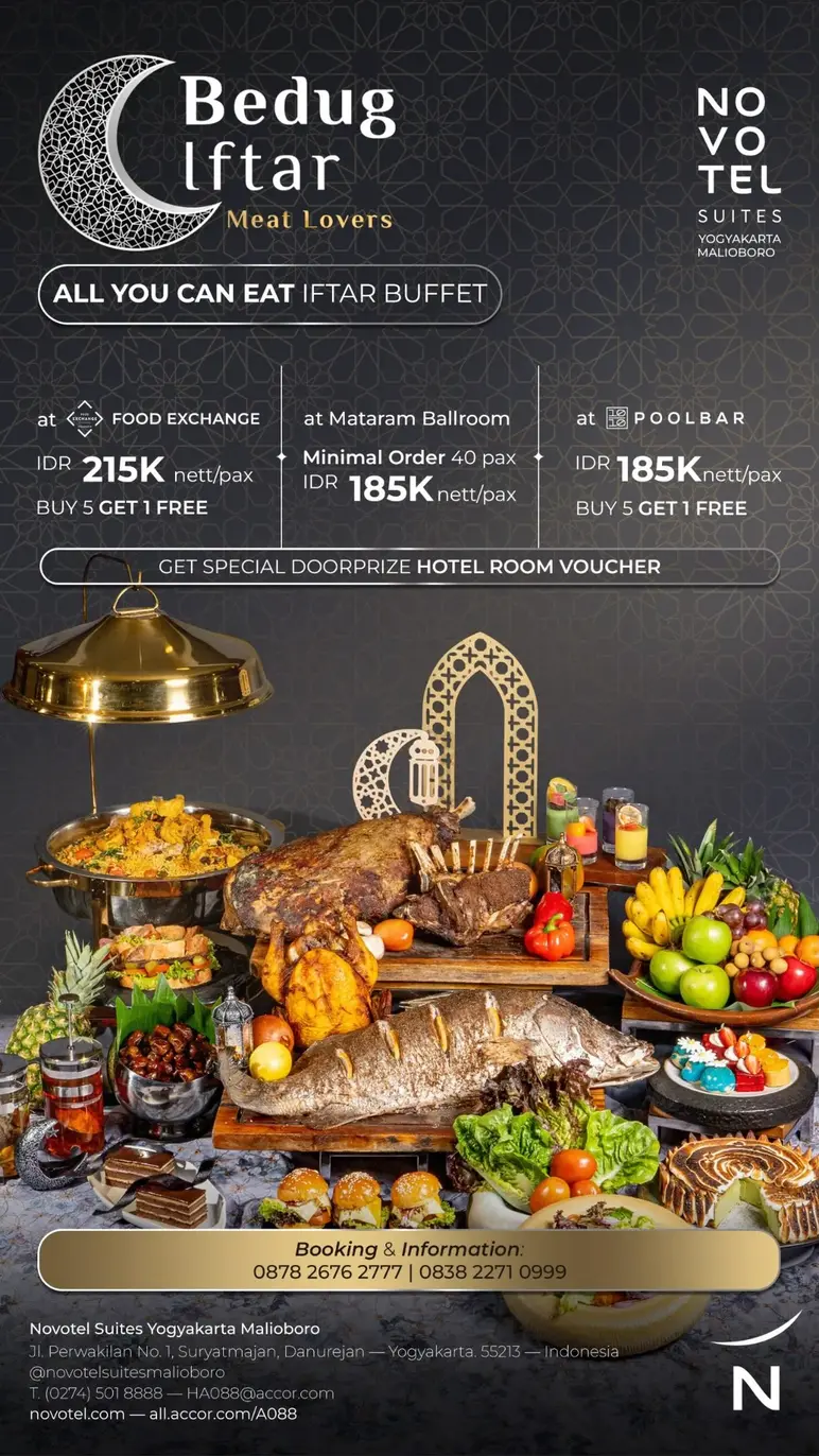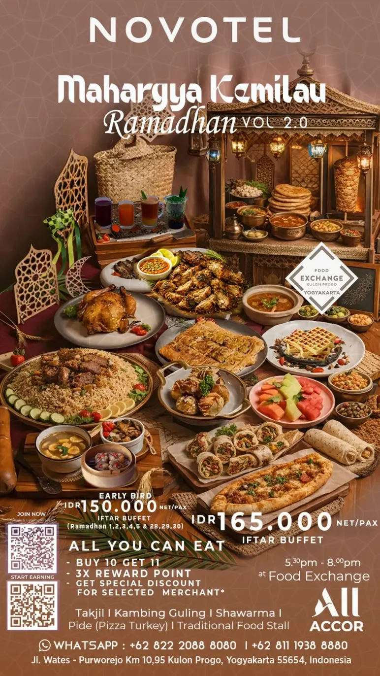 Novotel YIA presents an all-you-can-eat iftar experience called "Mahargya Kemilau Ramadhan Vol 2.0" for IDR 165,000 nett/pax. This experience is available at the Food Exchange from 5:30 a.m. to 8 p.m. during Ramadan.