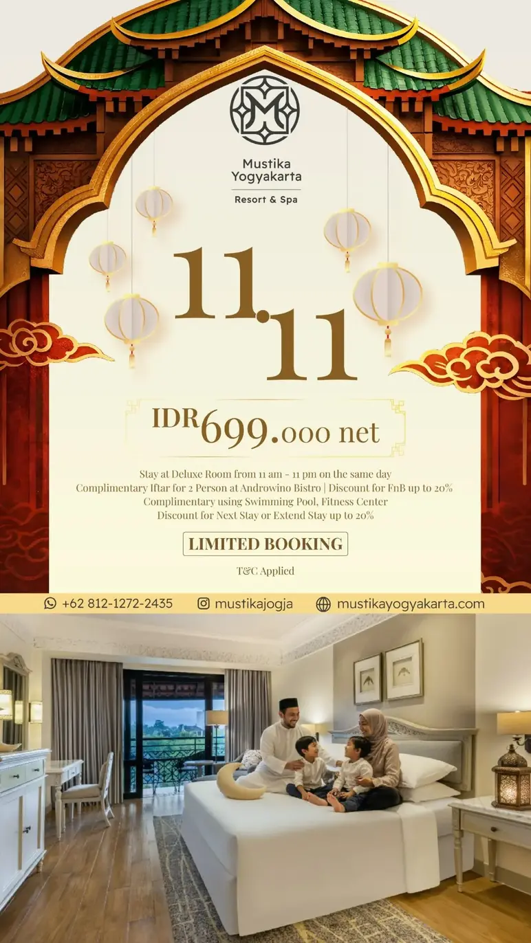 Mustika Yogyakarta offers an exciting staycation experience during this year's Ramadan, 11.11, at IDR 699,000 nett. Guests can enjoy a Deluxe Room from 11 am-11 pm on the same day, a complimentary Iftar for two at Androwino Bistro, a 20% discount on F&B, complimentary use of the Swimming Pool and Fitness Center, and a 20% discount on their next extended stay.