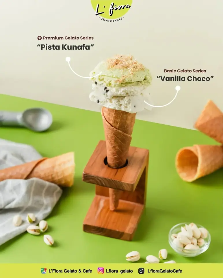 Beyond the delicious artisan gelato, which offers a wide variety of flavors (sometimes over 50), L'Fiora Gelato & Cafe's unique selling point is the provision of a complete menu that includes main courses, snacks, and pastries, differentiating it from purely gelato-focused shops. L'Fiora also innovates with specialty items like mochi mini gelato.