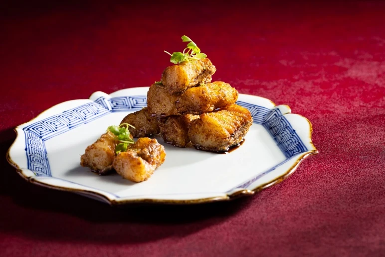 The experience opens with a delicate amuse-bouche by Chef Kadek, before unfolding into a sequence of dishes that reflect both contrast and complement. A Shanghai-style marinated deep-fried sea fish introduces a balance of crisp texture and soy depth, followed by pan-seared long-tailed anchovy wonton pot stickers, golden and richly savoury. The narrative deepens with black truffle xiaolongbao, where Chef Bao elevates a classic with quiet sophistication.