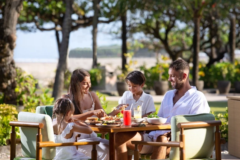 The resort’s five shimmering swimming pools, two with thrilling water slides, set the stage for days of sun-soaked fun and laughter. The experience is made complete with the resort’s All-Inclusive Dining Offer , inviting guests on a culinary journey through five specialty restaurants. Beyond the water’s edge, the spirit of Bali comes alive through immersive cultural experiences for family, like The Nusa Dua Journey through history, flavor, and rhythm with a Balinese cultural expert in traditional attire.